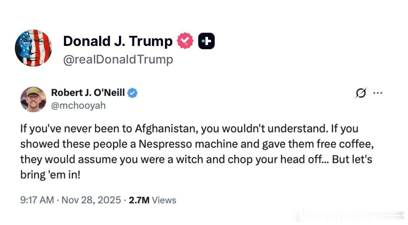 【黄金时代】川普转发:“如果你给阿富汗人看一台Nespresso咖啡机,还给他们免费咖啡,他们会以为你是女巫,然后砍掉你的脑袋……但我们还是把他们带进来吧!”美国和欧洲当代史川普主义研究热点现场海外新鲜事