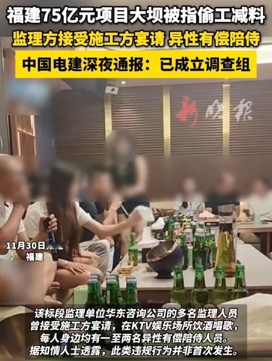 福建75亿水坝ktv有偿陪侍,监理方、施工方分别是,中国电建的孙子公司、儿子公司,是一大家人,叔叔请大侄子出去吃饭、玩玩,大侄子能不去吗,能敢不去吗,监理形同虚设!按规定施工、监理不能存在利益关系,近亲属规避制度,可是业主怎么招标的!水坝也算是民生工程,质量有问题,万一决堤了怎么办?常言道,千里之堤溃于蚁穴,需要彻查这些蛀虫!