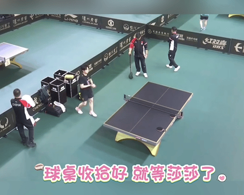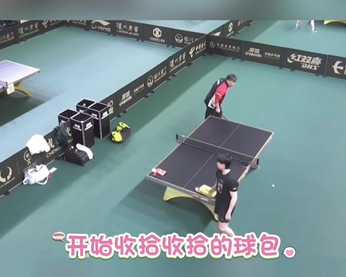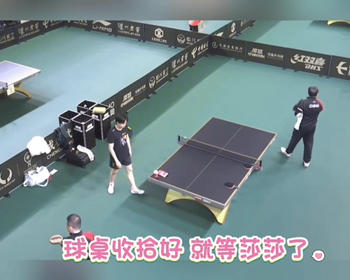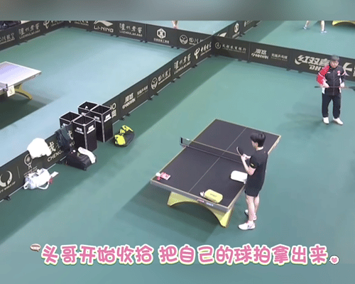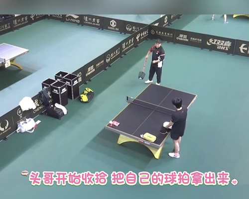 11.30日,王楚钦收拾好自己和莎莎的球包,等莎莎过来训练, 成都混团的开幕战是莎头的混双。 谁有头哥会收拾,莎莎在热身还没有过来, 头哥先把自己的球拍拿出来, 然后开始收拾球桌,把莎莎的球包拿走, 收拾桌子上的东西,等莎莎过来。 莎莎来了, 拿出球拍,直接开抡, 混团的比赛11点开始,莎头的开幕战是定下的。 王楚钦是成都混团的宣誓人。 期待精彩的比赛,加油加油。