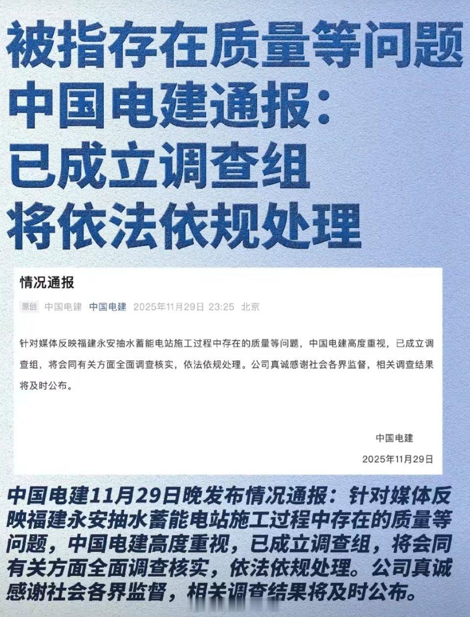 中国电建已成立调查组下水库大坝作为永安抽蓄电站关键建筑,其质量直接关系到电站安全运行,施工中的偷工减料行为可能危及大坝整体安全。中电建作为国企,必须严肃依法依规处理此事,给全国人民一个交代。