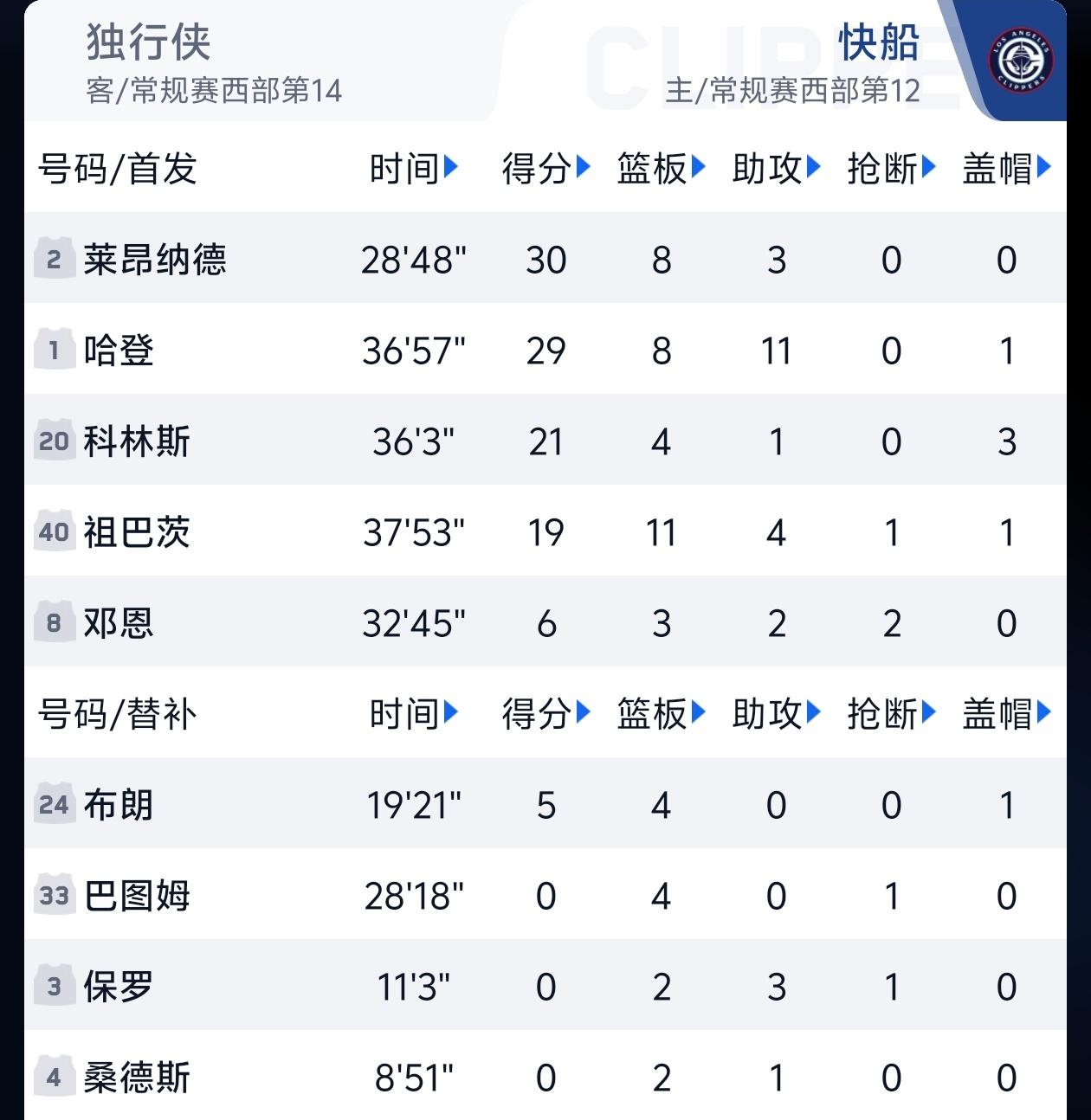 快船全场仅六人得分,替补只得五分! 快船输给独行侠的最大原因就是替补表现太糟糕,全场替补球员仅有布朗一人得到五分,其余替补球员无一人得分,哈登和小卡两位老将最后也是无力回天,只能看着球队继续输球。 反观独行侠虽然首发阵容得分能力不如快船,可是独行侠替补球员却是火力全开,仅克莱汤普森一人就得到了23分,威廉姆斯也有14分7助攻进账,独行侠打出了出色的团队篮球。