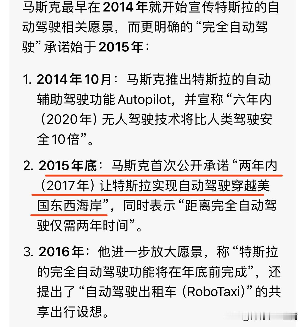 特斯拉FSD也开始显示自动驾驶里程占比了。 这感觉就像苹果跟进安卓的部分功能似的…… 一位北美网友晒出他的行程页面: 从芝加哥到佛罗里达,全程FSD占比是100%,一千多英里路,约合两千多公里…… 这就是FSD升级V14之后的能力,可以说是大踏步的进化,更加符合AI的特性、更像人一样开车,而不是规则约束下的辅助驾驶。 说起来,马斯克也是够大嘴的,10年前吹的牛,差不多今年从FSD V14这个版本开始才初步实现(图二)。 但即便如此,他依然是走在最前面的那个男人……