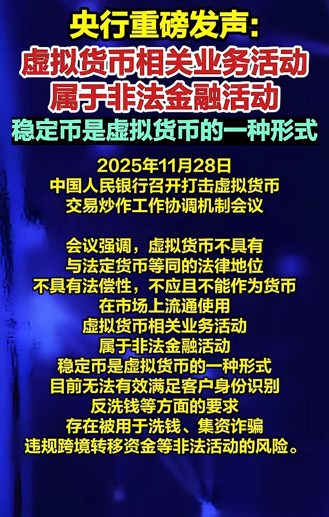 央行重磅发声: 虚拟货币相关业务活动属于非法金融活动稳定币是虚拟货币的一种形式