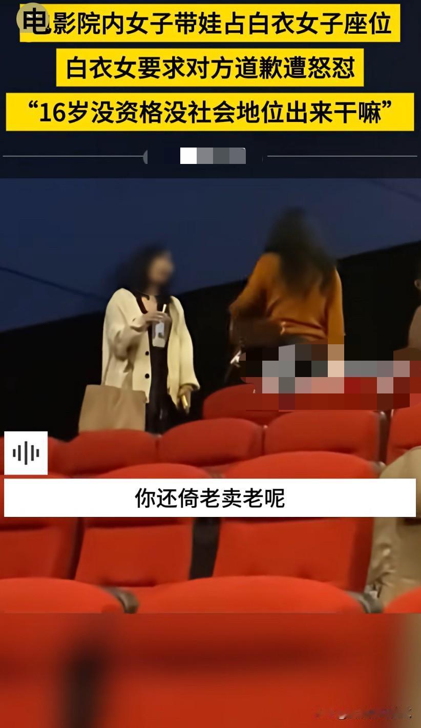 这年头恶人是越来越嚣张跋扈了! “电影院内女子带娃占白衣女子座位,白衣女要求对方道歉,没想到遭到了怒怼“16岁没资格没社会地位,出来干嘛” ”。妈呀,你有社会地位你给小孩买张票不要白嫖人家的座位嘛!这不是搞笑么?家里人都这么惯着你么,社会会给你上课的! 为16岁女孩点赞,为什么年轻的就得让着小的老的 ,难道这社会就小的老的有权利了吗? 再说花着钱也没有权利了吗?难道不是倚老卖老倚小卖小了吗? 这带孩子的有点无理了。 要知道父母是孩子的一面镜子哟。