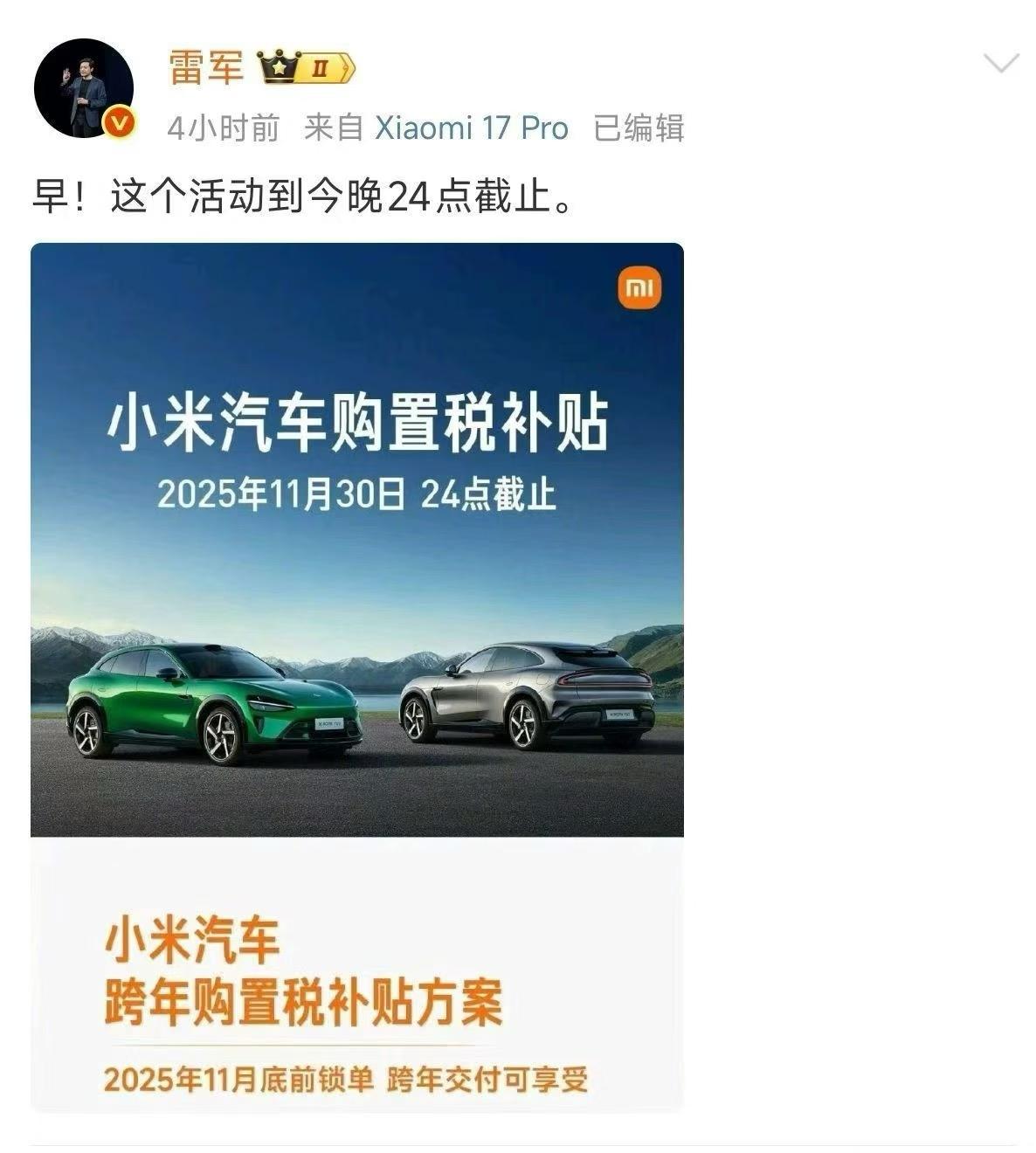 老板确认了 今晚24点截止; 今天下单,最高节约15000元购置税,相当于10年的充电电费