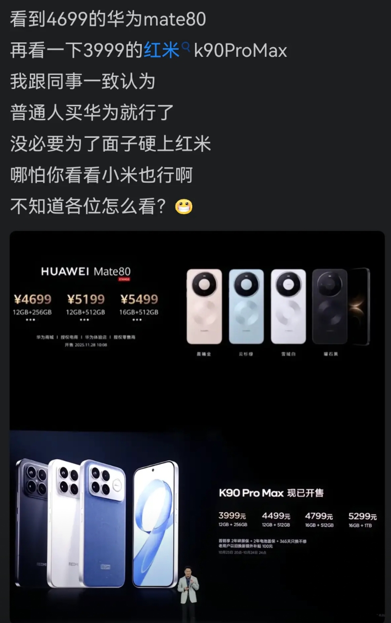 都说红米k90promax的性能 远远超过iPhone 17 promax,游戏性能肯定更强,但很多朋友说,如果不追求极致性能,不是特别爱玩游戏的话,mate 80综合体验感更好,正准备入mate80,我不玩游戏。 我就在想,为什么还是选择mate80呢?
