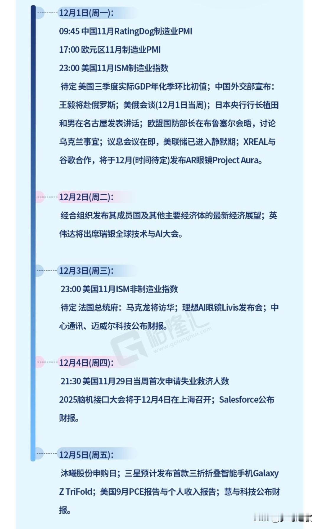 下周大事件汇总,很多经济数据将会影响下周A股的走向 周一会有美国的三季度实际GDP年化环比初值,这个数据很好的反应美国的经济情况,会让投资者判断出现在的经济情况,而且会影响投资者的决策。 周二主要就是看英伟达在AI大会上面有什么新科技发布,将会直接影响AI行业的投资 周四美国发布当周申请失业救济人数,这就直接会影响12月美联储降息的概率,会影响全球的股市走势,包括a股