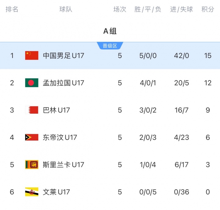 直播吧11月30日讯今日U17亚预赛最后一轮,U16国足战胜孟加拉国,5轮全胜领跑积分榜,成功晋级明年U17亚洲杯。最终积分榜如图。