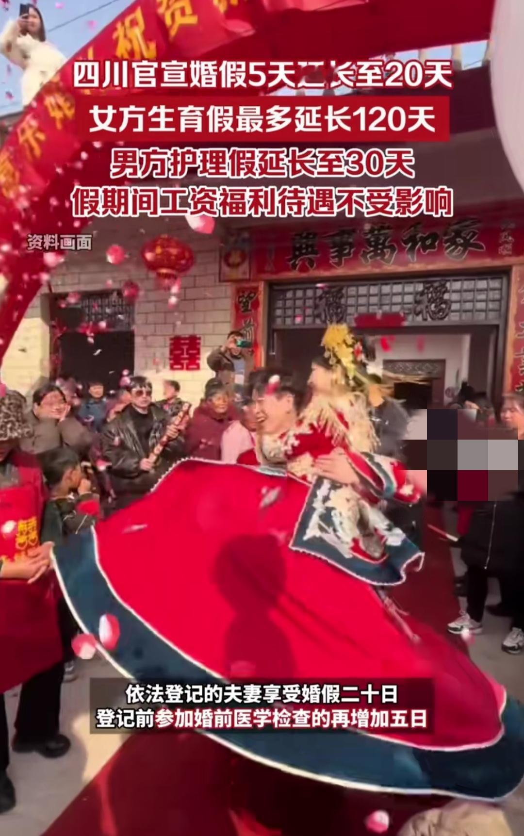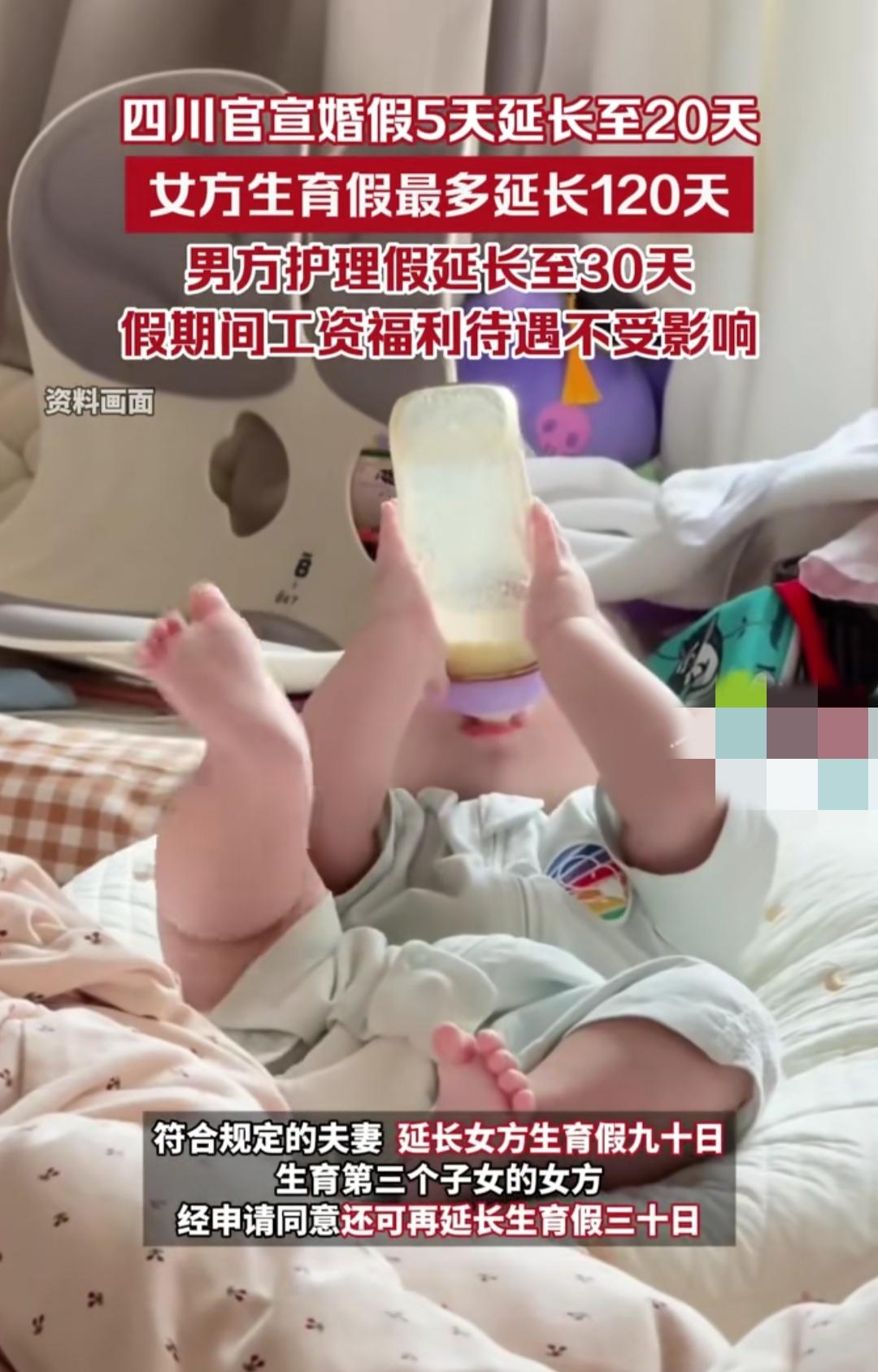 四川刚官宣的婚育新政,直接让全网羡慕哭了!婚假从5天暴涨到20天,男方护理假也延长到30天,关键工资福利还一分不少。 这可不是简单的假期增加,是给年轻人的一颗定心丸。现在多少人不敢结婚不敢生,怕婚假太短没时间筹备,怕产假不够恢复,更怕男方缺席育儿。四川这波操作,实实在在考虑到了家庭的难处。 政策的温度,从来都藏在这些细节里。它让新人能好好享受新婚时光,让宝妈有充足时间休养,也让宝爸有机会参与到孩子成长初期。这不仅是对家庭的关怀,更是给人满满的安全感啊!
