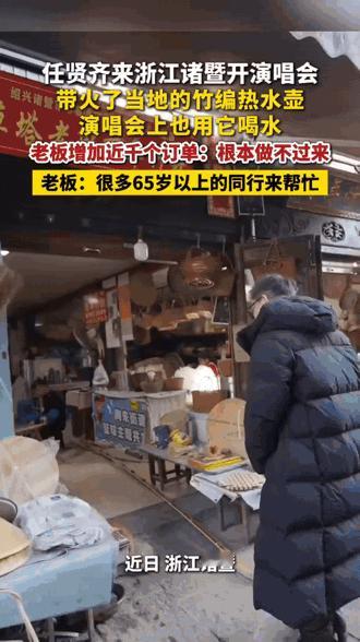 这位大哥还没意识到事儿有多火! 任贤齐来他店里买竹编水壶,跟他聊了半小时,他愣是没认出这位大明星。没想到任贤齐直接把演唱会上的温水瓶,换成了这诸暨手工竹编热水壶,网友们一看立马跟着晒同款。 大哥开的“百年竹器”店,订单几天就翻了五倍,杭州、上海、北京的单子都往这儿涌,现在订单都排到下星期了。他和老伴一天顶多编2到3个,忙不过来只能找同行帮忙,老两口最怕砸了招牌,对竹器品质看得特别死。 这就是竹器非遗传承人的坚持!他17岁就开始学手艺,竹子劈、刮、编的功夫样样扎实。现在店铺火了,他打心底里高兴,总算看到老手艺能好好传下去的希望了。任贤齐