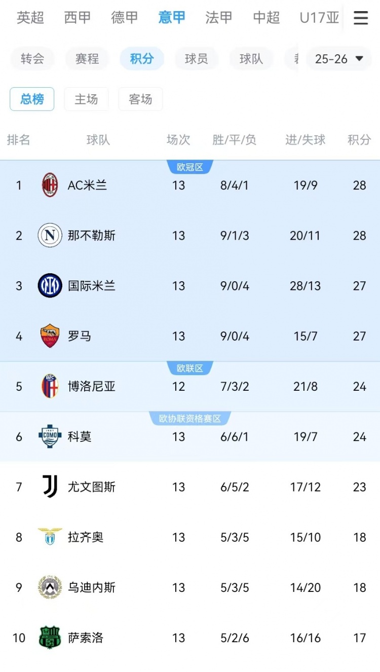 数据统计显示,这也是意甲联赛连续第2个赛季在13轮过后,前四名分差仍在2分以内。而此前30个赛季都从未有过如此情况。