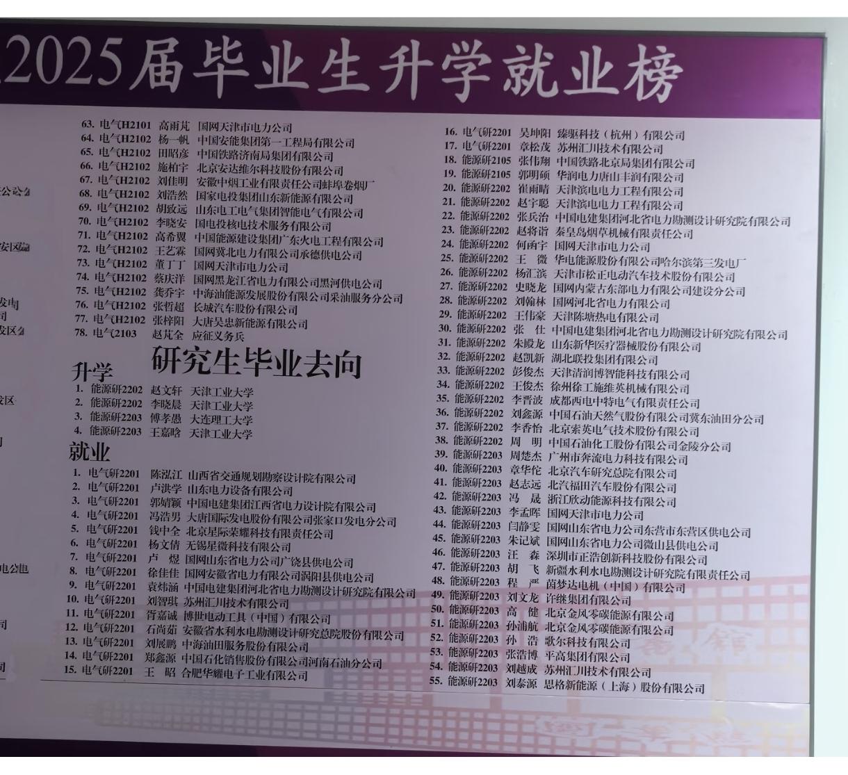 双一流大学天津工业大学热门专业电气工程及其自动化就业怎么样?本科生中,50人深造,78人直接工作;研究生中,4人继续读博,55人结束读研开始工作。本届毕业生具体有多少,我不太清楚,欢迎知道的提供数据,也可以看看还有多少待业的。 天工大2025届本科生中,有不少学生成功考入国内知名高校,如天津大学、华北电力大学、桂林工业大学、新南威尔士大学、华东理工大学、北京交通大学等,涉及多个电气相关专业的优质院校,为自身学术深造和专业能力提升提供了平台。就业的同学中,去向基本涵盖了电力、轨道交通、装备制造等多个领域的优质企业。例如有学生进入国网天津市电力公司、中国铁路广州局集团有限公司、中船安装集团有限公司、天津轨道交通运营集团有限公司等企业,还有部分学生入职华能国际电力股份有限公司、平高集团有限公司等能源电力领域的知名企业,就业选择较为广泛且具有行业针对性。 研究生呢,工作为主,少量继续深造。仅有四个学生选择继续深造,如能源研2202赵同学、能源研2202李同学、能源研2203傅同学、能源研2203王同学分别在天津工业大学、大连理工大学等校攻读更高学位。 大部分还是直接就业了,就业单位涵盖电力、轨道交通、装备制造、能源等多个领域的优质企业。例如电气研2201陈同学入职山西省交通规划勘察设计院有限公司,电气研2201卢同学进入山东电力设备有限公司,还有学生入职中国电建集团江西省电力设计院有限公司、大唐国际发电股份有限公司张家口发电分公司等企业;能源类研究生则入职中国铁路北京局集团有限公司、华能电力唐山水丰润有限公司、国网天津市电力公司等单位,就业方向广泛且与专业契合度较高。 简单来说,天津工业大学电气工程学院的这批毕业生,不管是升学还是就业,都挺“能打”的,对得起当初考进来的高分。 升学的学生,要么去了天津大学、华北电力、北京交大这些电力领域的强校,要么出国读名校,学习上很给力。 就业的学生,基本都进了“好单位”——不是国网电力这种铁饭碗,就是铁路、能源巨头这类大平台,专业对口还稳定,福利也不错。 这说明电气工程这个专业本身很吃香,行业需求一直很旺,学校也很给力,不管是想继续读书还是直接上班,都能给学生铺好路。