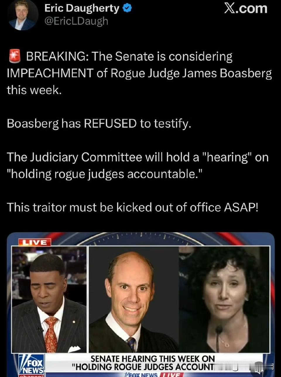 参议院考虑对参与北极霜行动迫害川普的极左法官进行弹劾。美国的法官权力大无边,可以指挥总统干这干那。弹劾是除了判刑事罪外唯一的约束方式,但非常难,需要三分之二的参议员同意,民主党议员肯定不会同意。