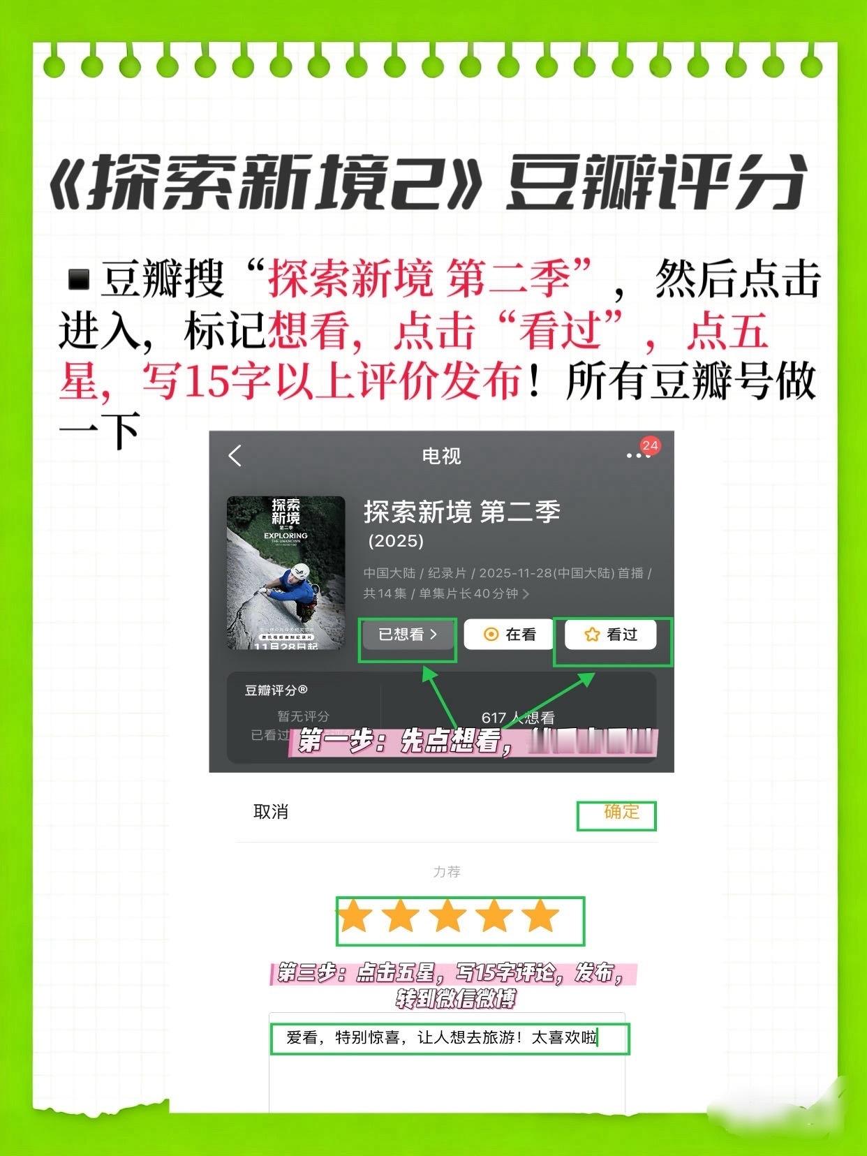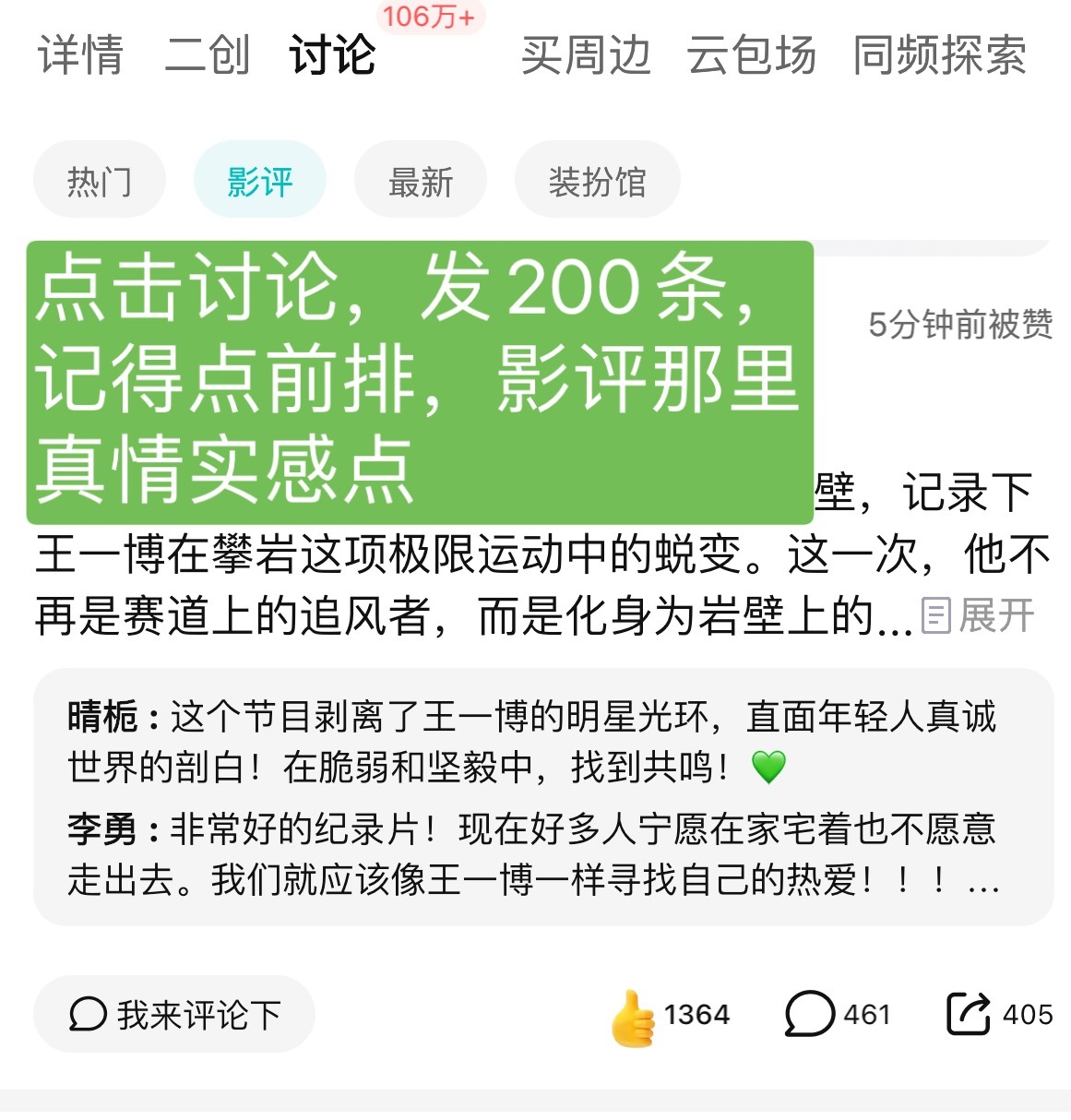 新的一天,我们继续来维护《探索新境2》和《新境日记》评分和基础📊!❗️进群《探索新境2》发讨论弹幕群1️⃣评分:腾讯浩没有评分的记得按照图一评分!!评过的利用自己的人脉拉5个人,看五分钟就可以整,正片评分完毕日记记得补!!突破10万预约人数咱们的小目标2️⃣弹幕维护:第二集、第三集预告弹幕非常不够,大家今天也要每人打卡200条!一定要做,不执着热度不是不做弹幕。3️⃣搜索➕讨论:先搜索,再点进去发,讨论总目标超过第一季,定200万,今天到111万,非开播日每天5万咱们发一发!一人200条【弹幕和讨论同步的方法看图五】教程看▪️全平台评分▶️网页链接▪️发讨论手动教程▶️网页链接▪️发讨论解放双手全自动教程▶️网页链接▪️发弹幕&弹幕互动教程▶️网页链接