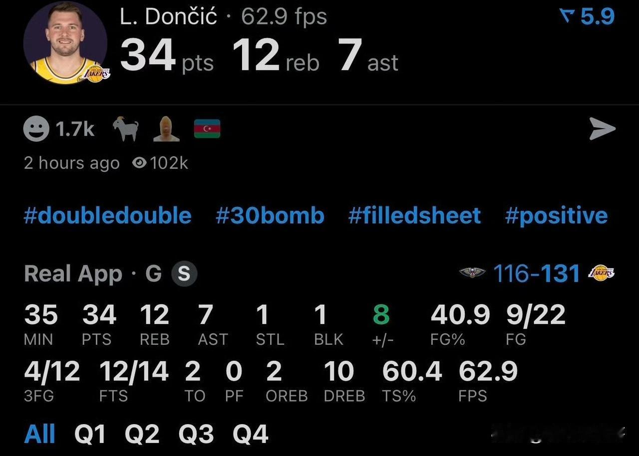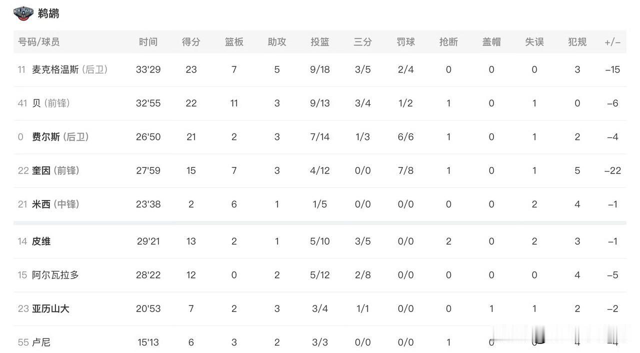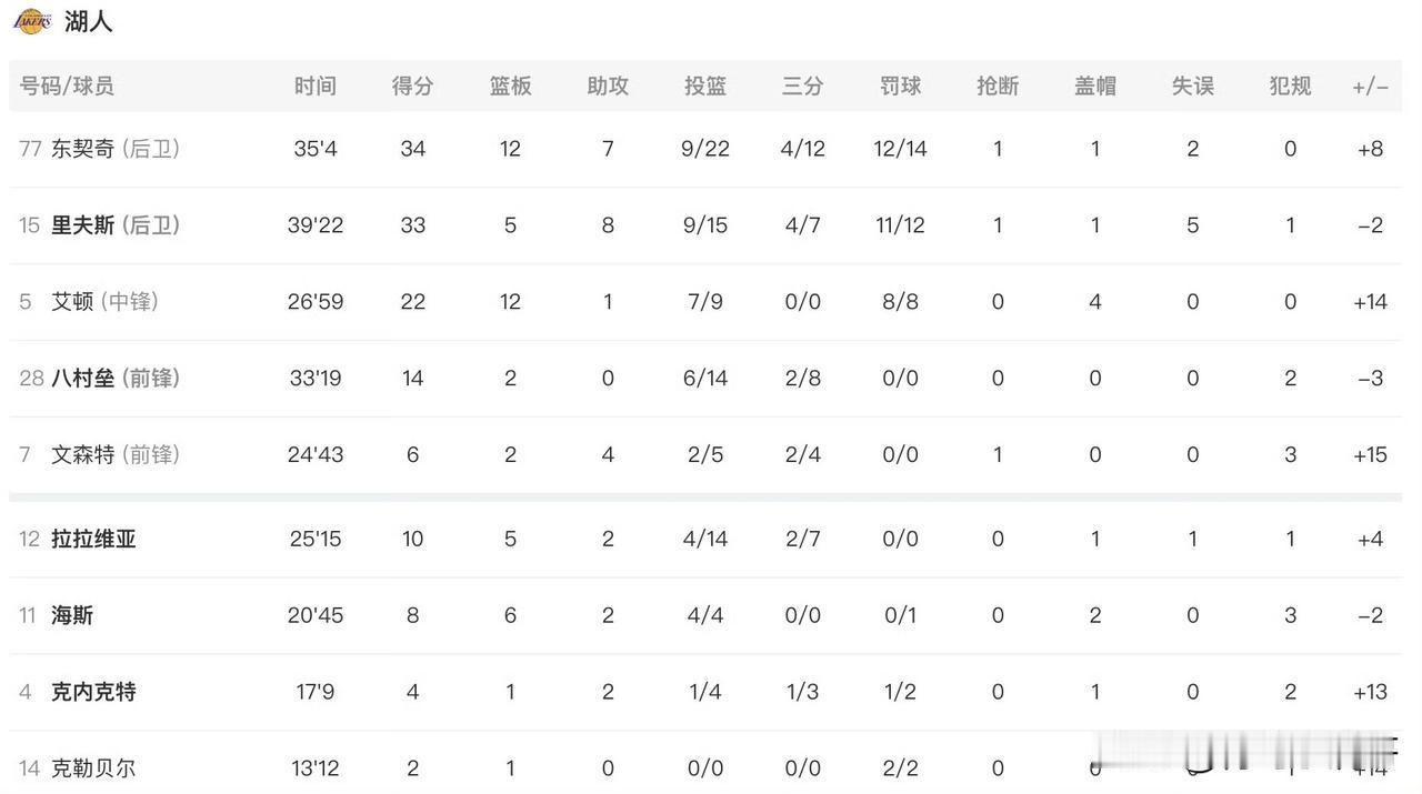 艾顿伤退!!!东契奇34+12+7,里夫斯33+5+8,湖人主场大胜鹈鹕! 北京时间12月1日,湖人主场迎战西部倒数第一的鹈鹕,本场比赛詹姆斯缺阵,不过湖人仍然轻松的以133-121大胜鹈鹕,收获七连胜。 本场比赛要不是鹈鹕自己给自己在首节就挖了个大坑,他们还真的是可以和湖人打的不相上下,首节他们以27-46落后湖人接近20分,可以说一上来就被打蒙了。 湖人方面,东契奇和里夫斯的双后场组合合计拿下67分17篮板15助攻,这样的后场双枪实力太强了。 艾顿拿下22分12篮板,不过他受伤后退出了比赛,打的非常的高效。 鹈鹕方面,主力都缺战,但是他们仍然打出了自己的实力,首发五人中三人拿下20+,替补端也有两人得分上双,这方面是比湖人强的。 恭喜湖人拿下比赛,明天继续坐镇主场打太阳,加油! 湖人赛程 湖人阵容名单 湖人队里夫斯 湖人伤病 湖人 东契奇 里夫斯