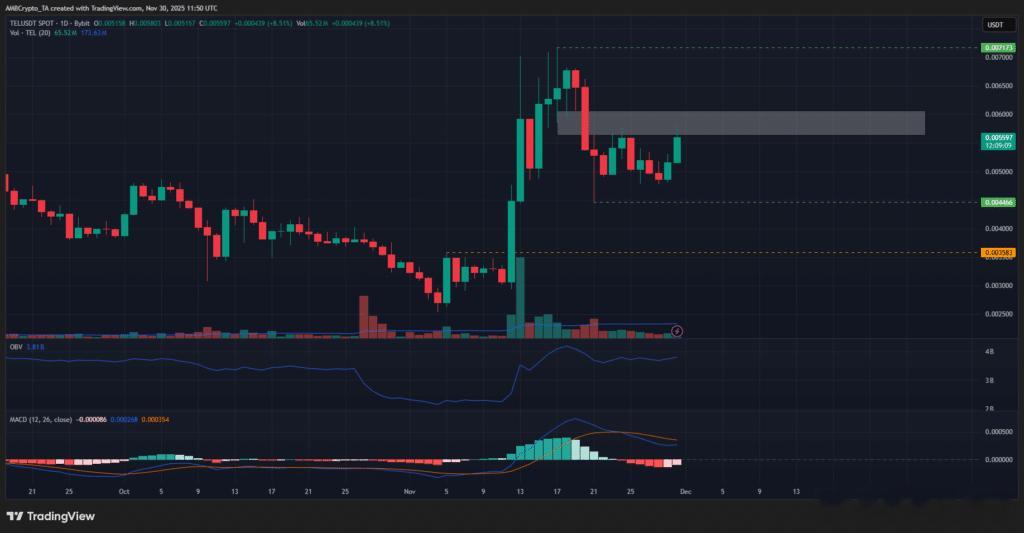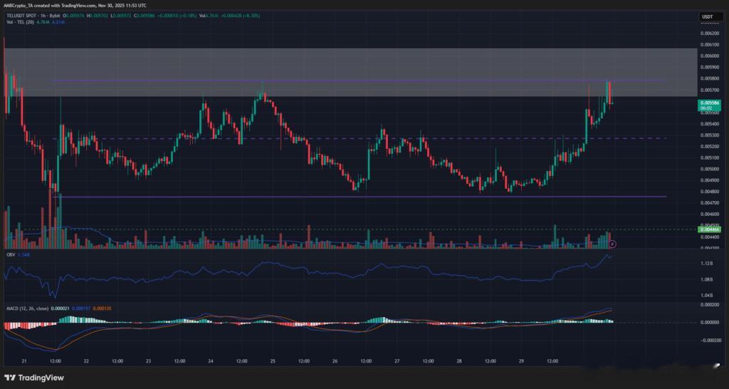 Telcoin 过去 24 小时涨 13.3%,交易量飙升 177%,稳住关键支撑 0.00475 美元。11 月 12 日,Telcoin 获内布拉斯加州银行特许经营权,将推出首家区块链银行,eUSD 成首个银行发行的链上美元稳定币,消息刺激市场需求,三周涨幅已 83%。短期价格在 0.0047–0.0057 美元震荡,交易者可理性等待支撑位稳固再布局。tel区块链山寨币