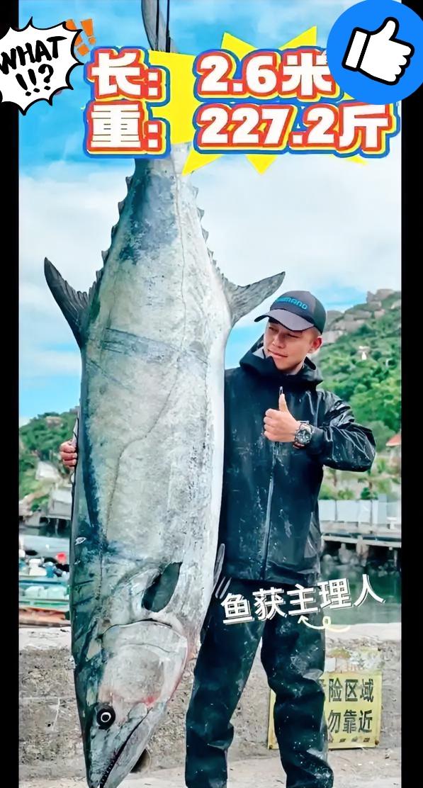 一男子钓到重达200多斤近3米长的“鱼王”。 11月29日,珠海万山区担杆镇庙湾海域上演“巨鱼出水”奇观——一名钓友钓获一条长2.6米、重达227.2斤的中华马鲛鱼,需5名成年男子合力才能抬动。这是该海域近十年捕获的最大个体了。 这条“巨无霸”马鲛鱼的现身,让人不禁惊叹,海洋的馈赠,这份激动应该钓鱼者才懂吧。 中山鱼王 手杆钓鲅鱼