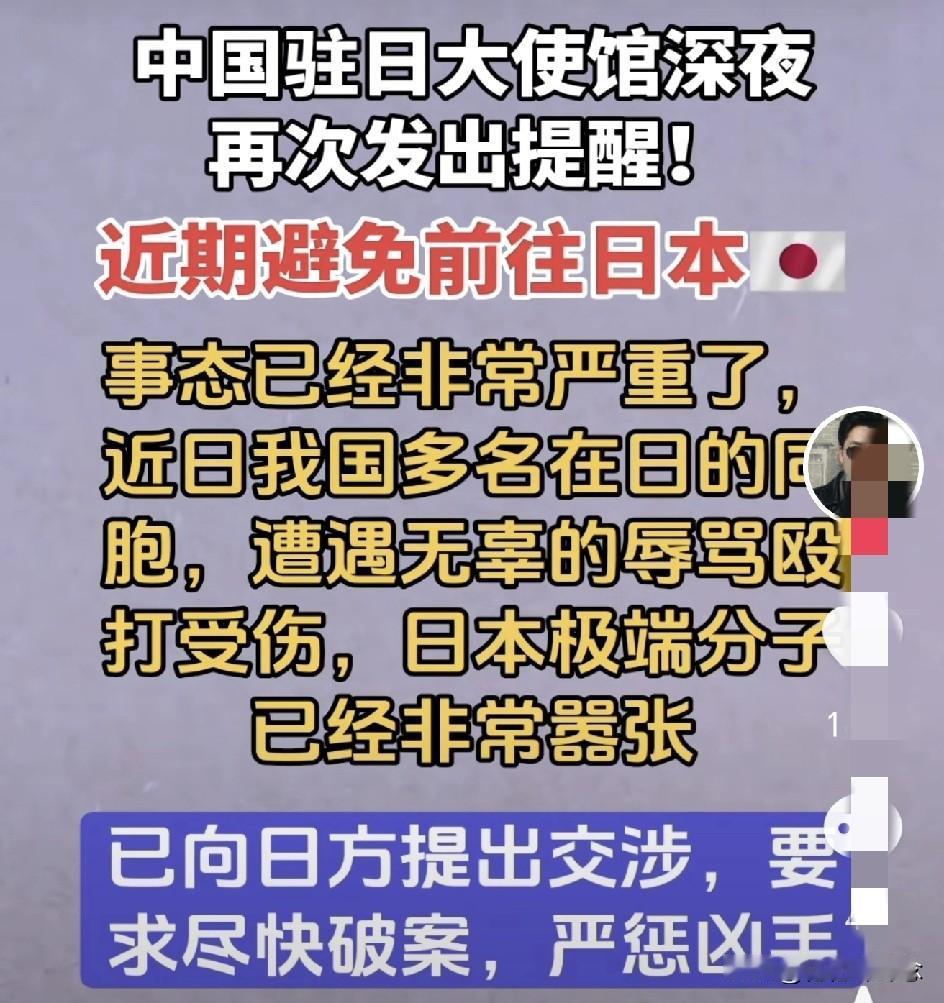 在日本遭遇无端追打的旅日同胞在线倾诉遭遇,部分同胞对此表达了不满情绪。 有网友认为这是自食其果,因为外交部、文旅部已多次发布安全提醒,建议中国公民近期避免或暂缓赴日行程,可仍有部分人无视警示前往,最终陷入风险。 但这种“遇袭后不值得同情”的观点并不客观,也非主流——不少旅日同胞是因留学、商务、合法居留等刚需停留,并非“执意前往”,他们遭遇无差别暴力本就是无辜受害者。 国家始终重视公民安全,驻日使领馆不仅第一时间为受害者提供领事协助,还多次向日方交涉要求严惩凶手,绝非“不欠同情”。 民族利益与公民合法权益并不冲突,国家的安全提醒本质是为了保护每一位同胞,希望大家重视官方警示、敬畏安全风险,同时也应对无辜受害的同胞保持基本共情,共同谴责施暴行为与日方的消极处置态度。 网友说:作为国民!应该是以党和国家的说法为准 官方都提醒赴日有风险了,确实有人没当回事,可也有同胞是刚需留日啊。 国家一直护着咱们,使馆也在积极交涉,咱们该骂施暴者和日方不作为,对受害者多份共情,也得记着重视安全提醒。 他们遭无端殴打多无辜,哪能说“活该”?你们怎么看?欢迎评论区留言