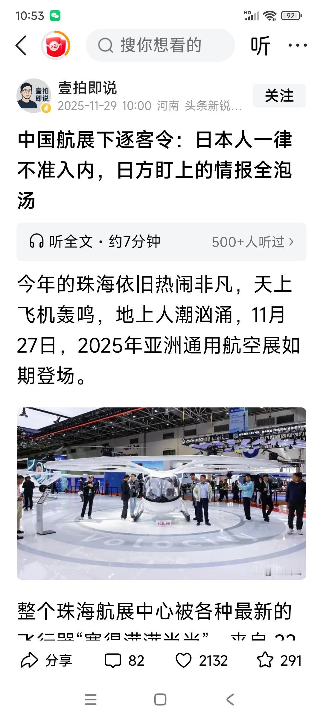 珠海航展,中国下逐客令:日本人一律不准入内! 评几句:这就对了。别跟我扯什么礼仪之邦、大国风范,别忘了我们还讲究“朋友来了有好酒,豺狼来了有猎枪”,得先确定来的是什么。 这是航天航空领域,不是涉及老百姓衣食住行的民生领域,不是救死扶伤的医疗领域,尤其是在当前的敏感时期,不是什么人想来都可以来的! 非常时期,我们要扎紧篱笆防野狗,擦亮猎枪打豺狼!