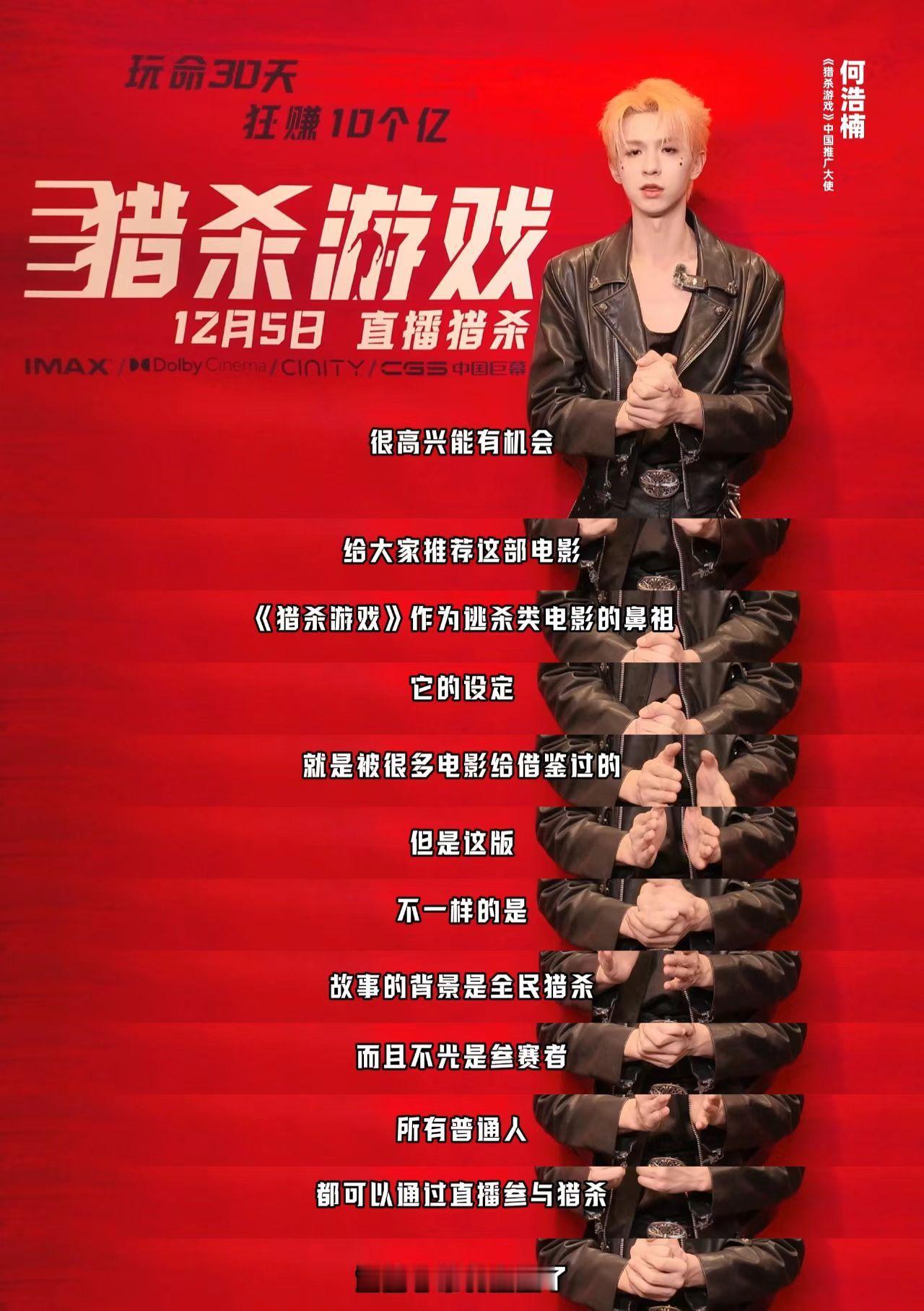 何浩楠何浩楠献唱猎杀游戏推广曲 热血开唱引爆期待!何浩楠献唱电影推广曲,旋律里的张力适配影片实拍爆破、极限逃亡名场面,声线自带感染力,特辑上线速循环,坐等影院沉浸式感受猎杀热血!何浩楠猎杀游戏中国推广曲特辑