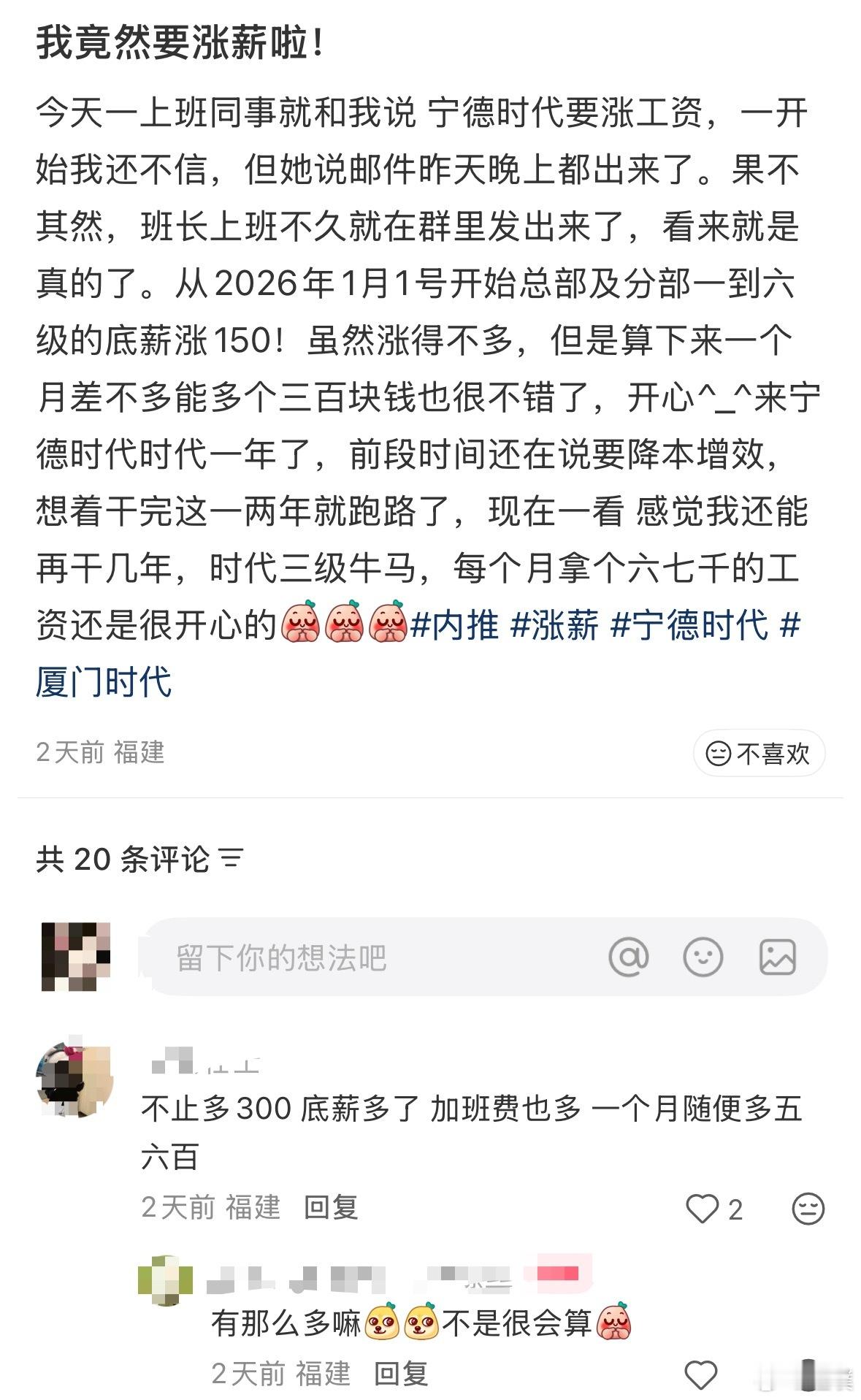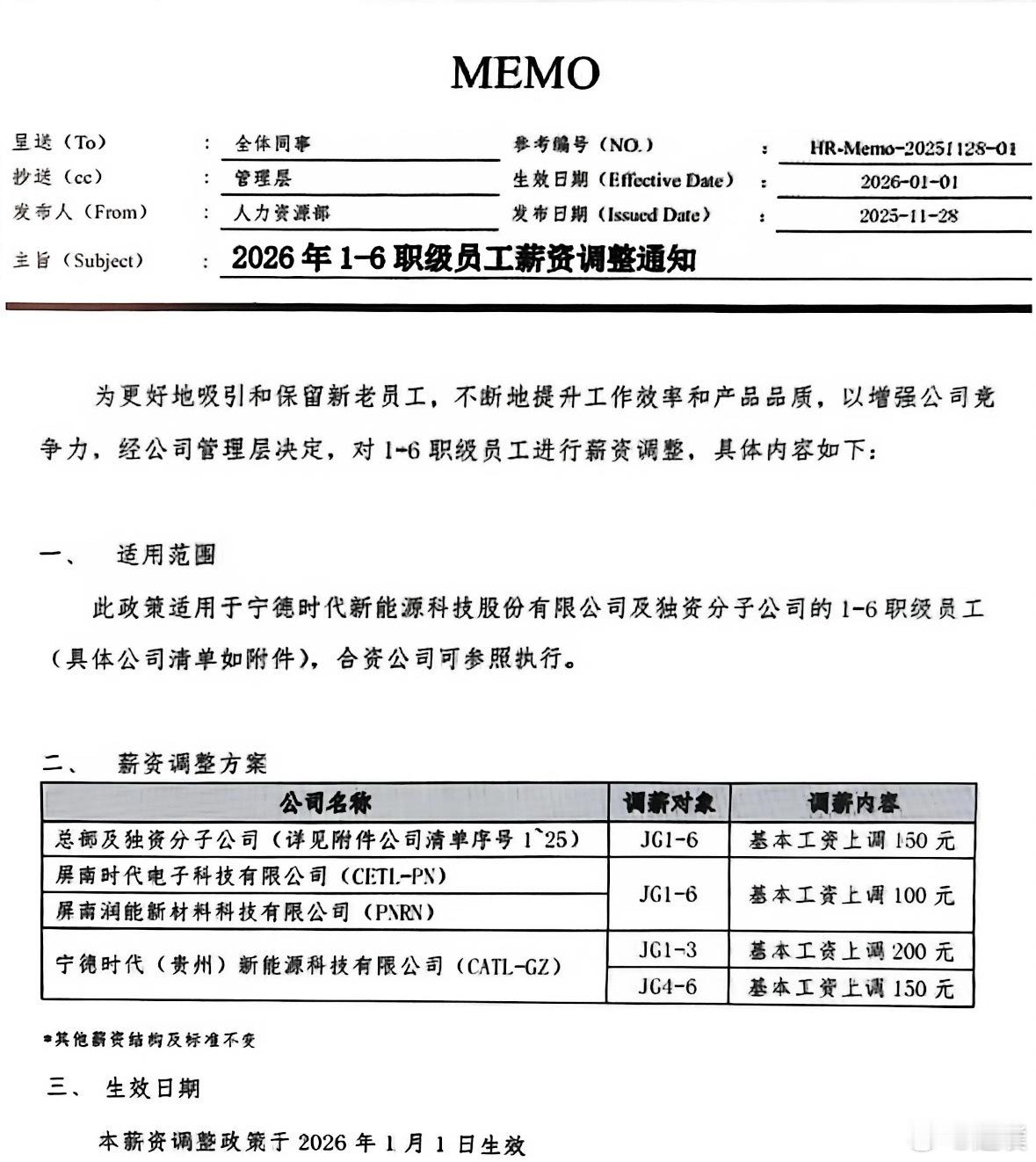 宁德时代发布涨薪通知 虽然每个月基础工资才多了150,但涨工资了就是好事啊