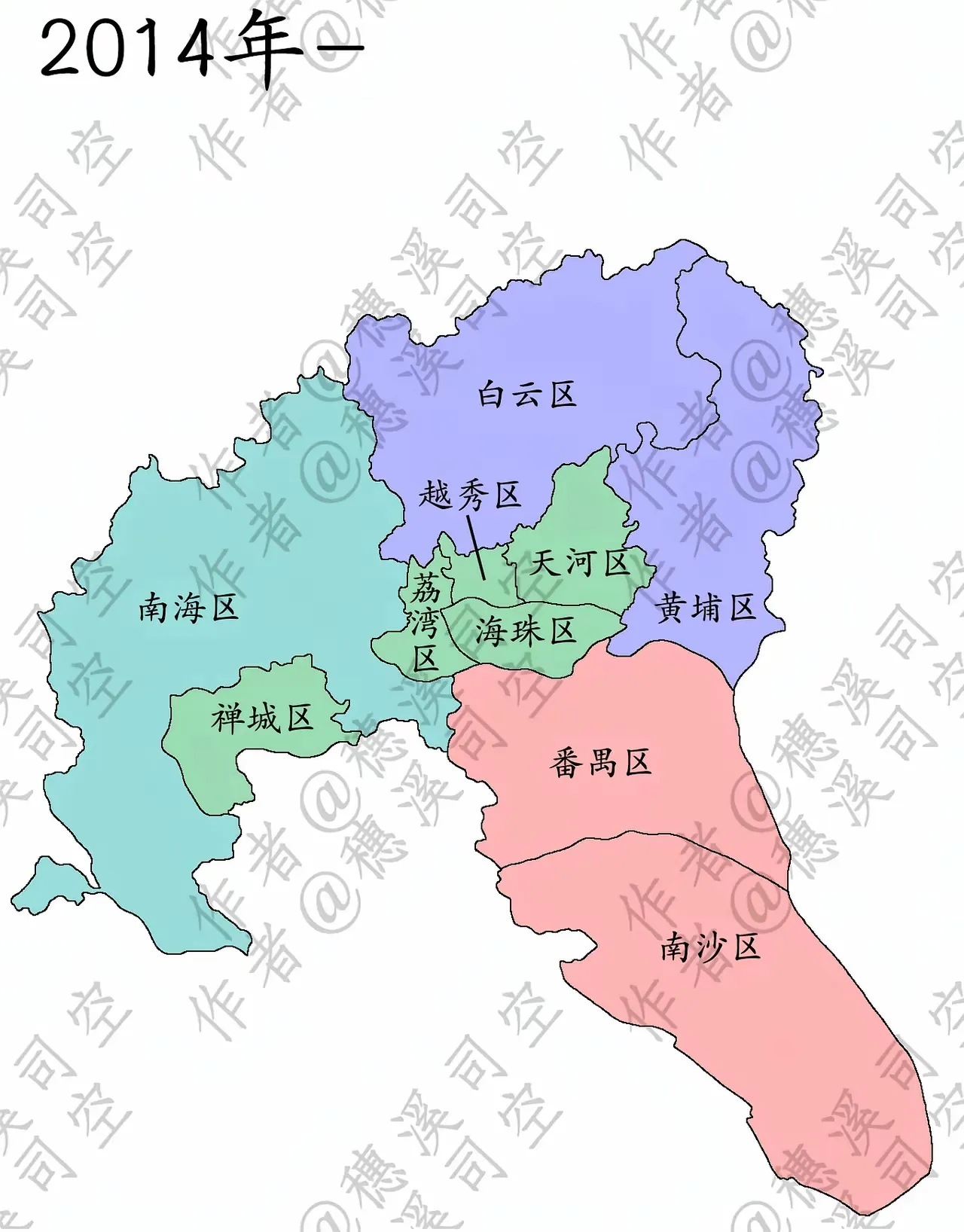 一百年来,广州、佛山行政区划变迁示意图。番禺与广州、南海与佛山的关系总是有那么一点微妙,历史上,南海,番禺都是广东的首县。究竟谁是爸爸,谁是儿子?三十年河东,三十年河西。谁也不要不服气!