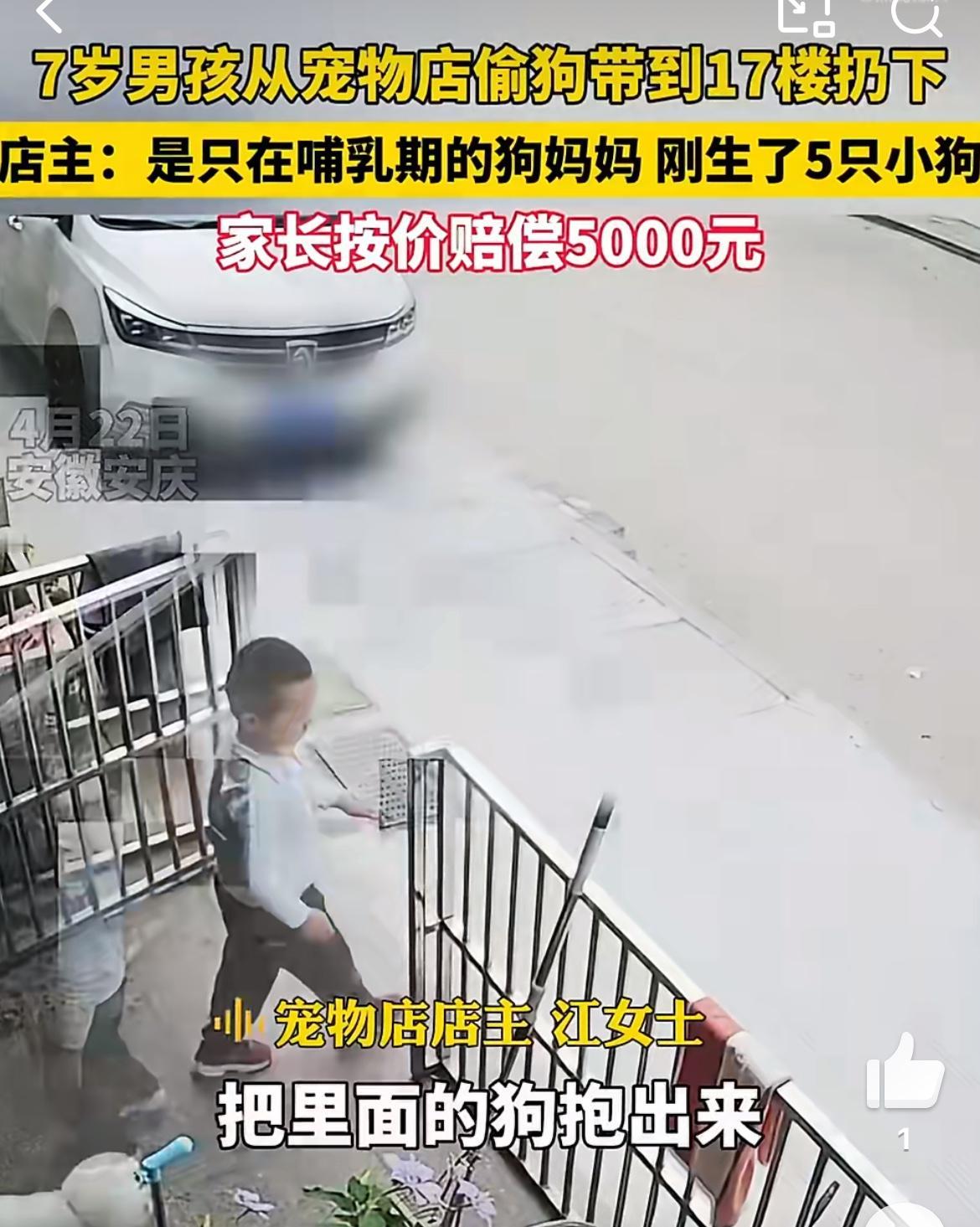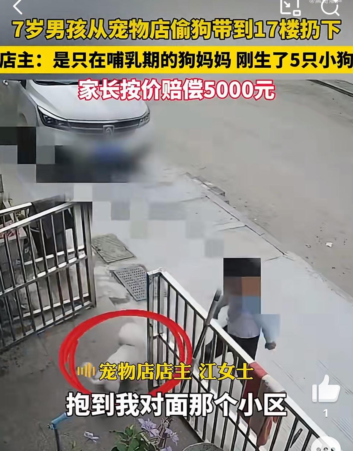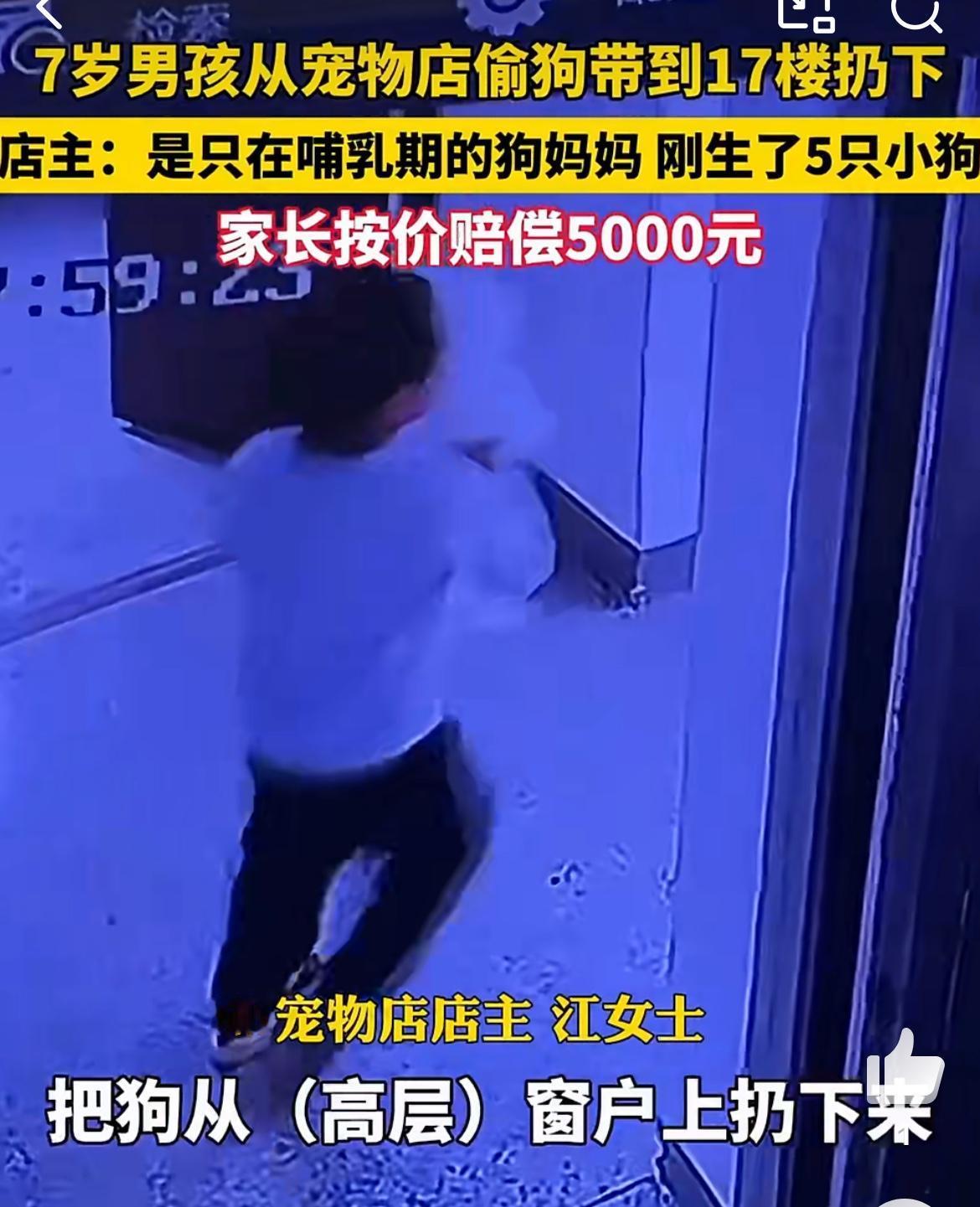 7岁男童宠物店偷狗17楼扔下,想不出这孩子生性怎么如此残忍。一只刚刚生仔的母狗,没有对孩子有过激举动。是这个孩子打开宠物店的围栏进去偷的狗,把狗带17楼,从阳台丢下去,狗当场摔死。家长为孩子辩护,说孩子小不懂事,正常这个阶段的孩子主动去谋杀一个大型动物,绝对是不敢的。孩子偷零食 孩子偷盗行为 男童被偷
