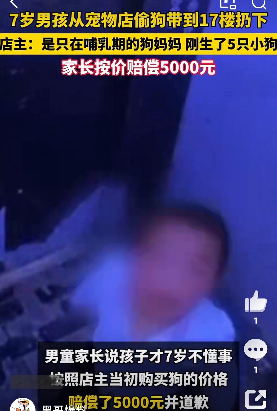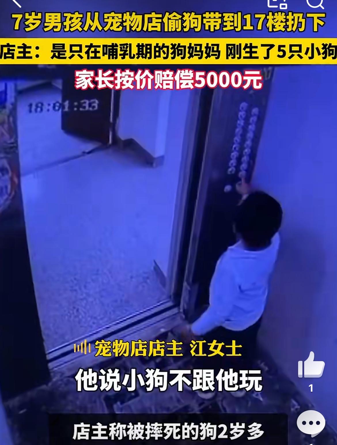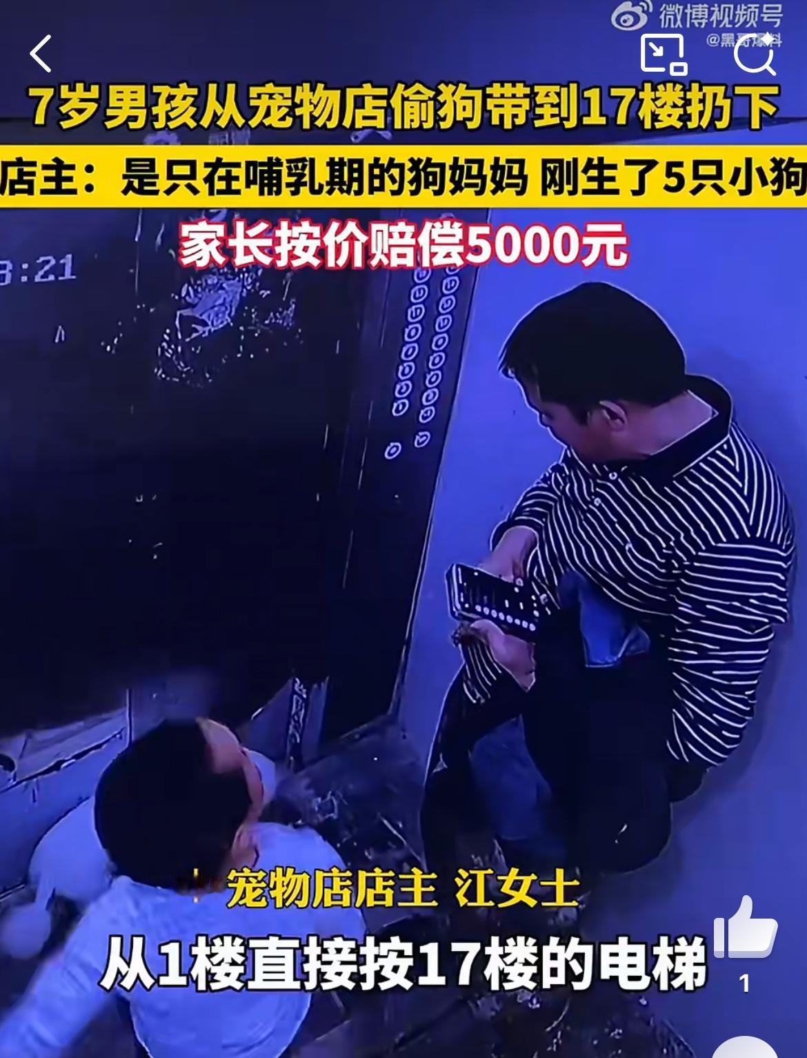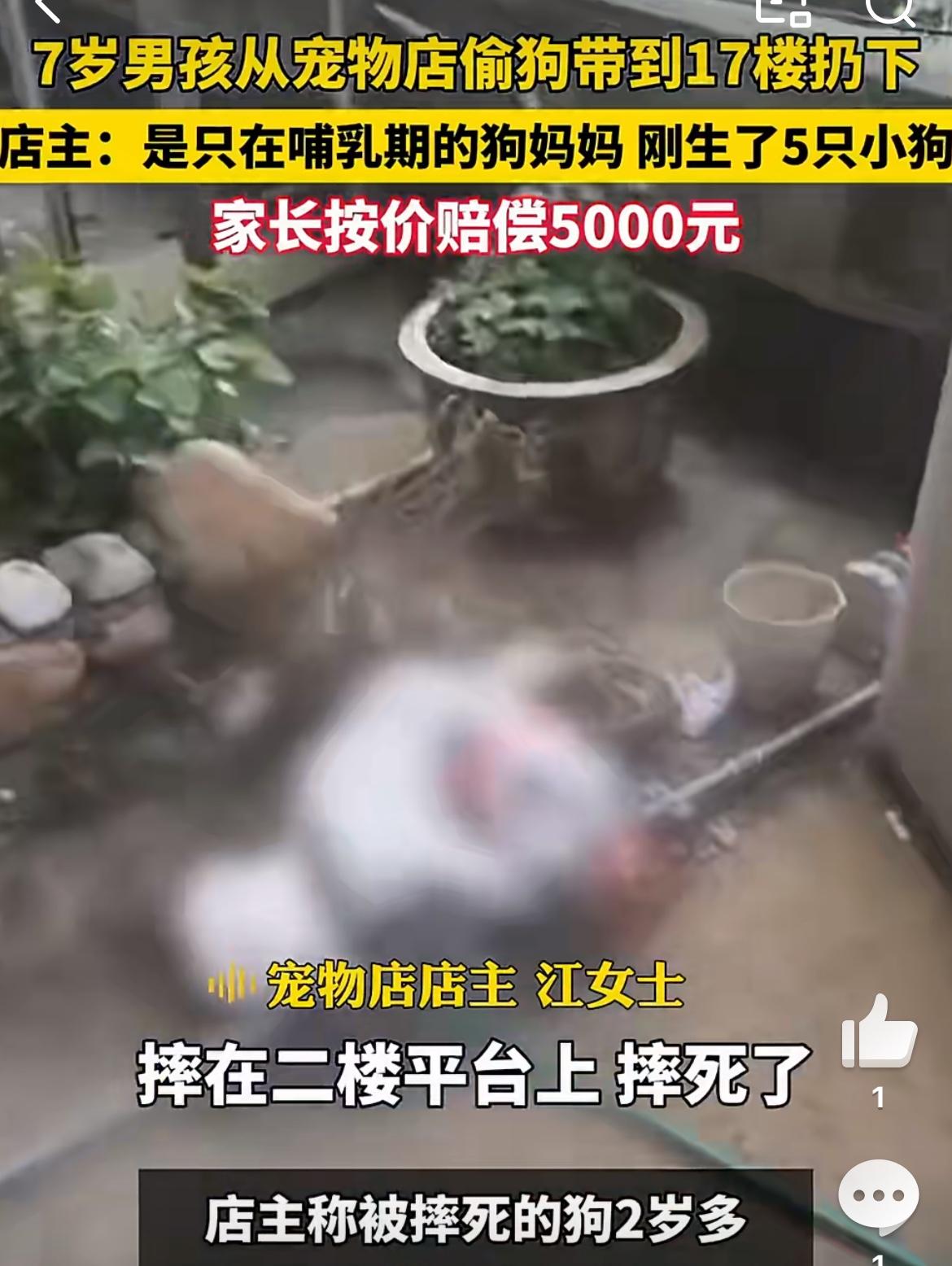 7岁男童宠物店偷狗17楼扔下,想不出这孩子生性怎么如此残忍。一只刚刚生仔的母狗,没有对孩子有过激举动。是这个孩子打开宠物店的围栏进去偷的狗,把狗带17楼,从阳台丢下去,狗当场摔死。家长为孩子辩护,说孩子小不懂事,正常这个阶段的孩子主动去谋杀一个大型动物,绝对是不敢的。孩子偷零食 孩子偷盗行为 男童被偷