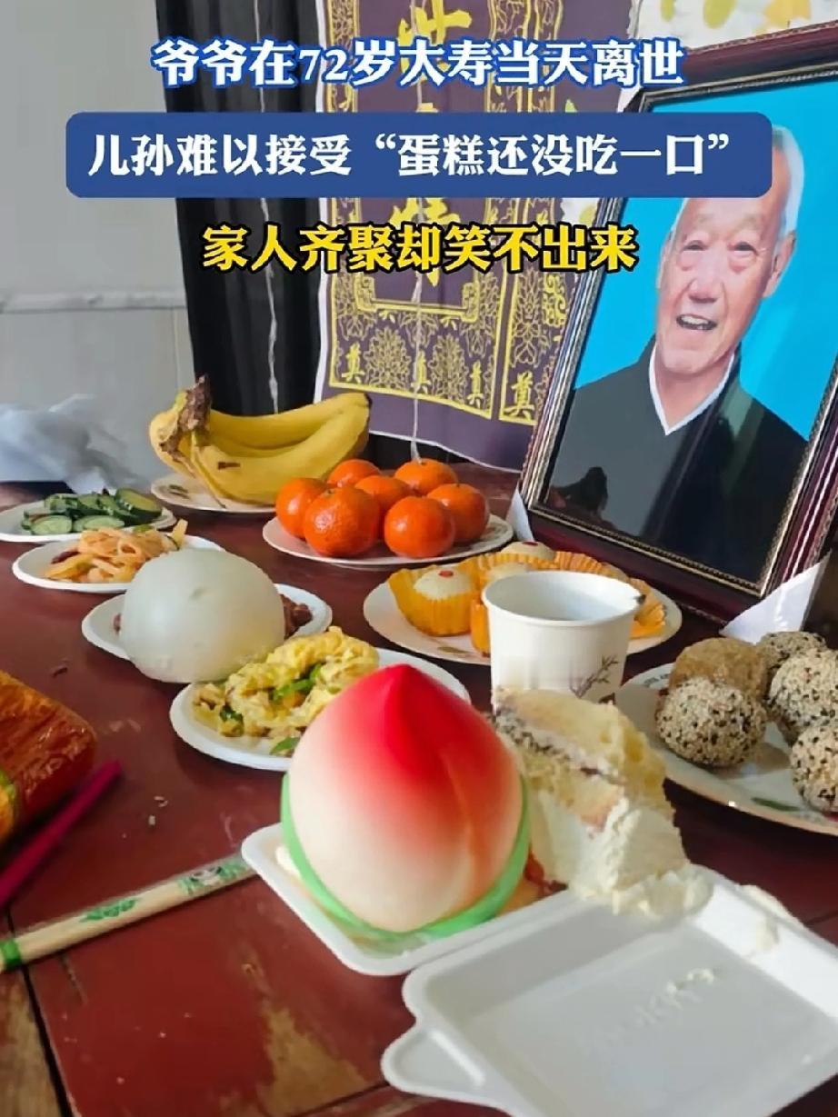 爷爷在72岁大寿当天离世,儿孙难以接受“蛋糕还没吃饭一口” 老人走的太急促,没来得及过完自己的生日,抛下满堂儿孙撒手而去!儿孙们没有任何心理准备,天塌般的噩耗让儿孙们没法接受,做梦都没想到忌日与生日赶在同一天,究竟是命运安排还是巧合?多希望老人过完生命中最后一个生日再走!可命运就这么惨忍,生命的轮子,一秒都不能多停!走的那么干脆! 生命无常,我们无法掌控,只有珍惜身边人,也许会少些遗憾!