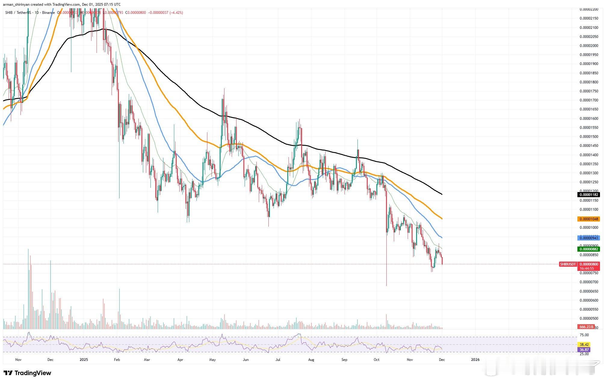 SHIB 最近在0.0000078-0.0000080美元区域出现双底反弹,看起来卖方短期内很难压低价格。不过,别高兴得太早,这只是可能的反转信号,还没完全确认。50日、100日、200日均线都在下降,强力阻碍上涨,0.0000093-0.0000105美元的阻力墙更是反弹的第一目标。成交量依旧平淡,如果买盘不够强劲,真正的反转可能不会来。短期来看,只要守住0.0000080美元,突破0.0000090美元就能带来一次小反弹,但长期趋势仍偏空。跌破底部则可能创新低,所以保持关注,别盲目追高。区块链山寨币