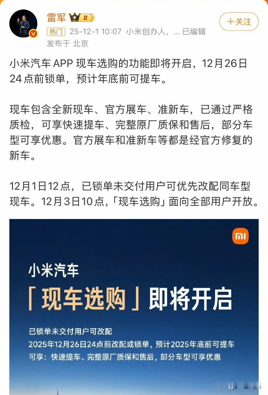 小米车主的福利来了! 汽车交付晚,怎么办? 小米推出了,现车选购模式,大量现车可选购。 现车,主要包括全新现车,官方展车,准新车。 简单点说,其实就是运损车,库存车以及展车。 不过这政策,对于急于提车的人来说,是利好的,马上2026年了,而且还有部分优惠。 从这个现车方案来讲,小米面临的库存和退订压力,都是存在的。明年可能要推出改款新车,若不及时卖掉,库存压力更大!