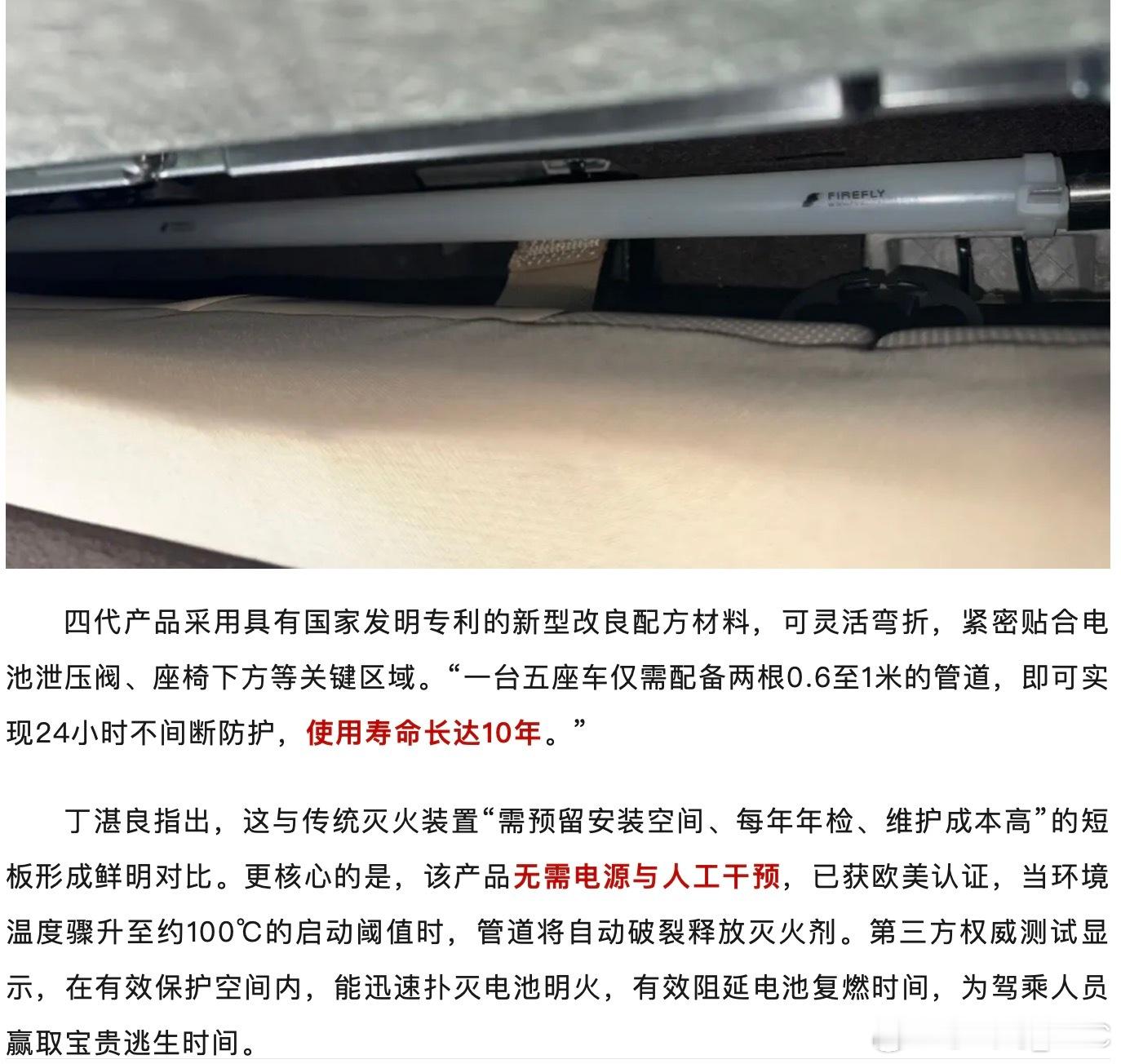 刚看到一篇报道,有一个发明柔性灭火管2秒快速释剂、10秒精准灭火,解决电动车热失控的痛点。但是电芯热失控不需要外界氧气,就能自发的一直进行下去。伴随着隔膜融化、电解液分解、正极释放氧气一连串反应,让电芯内部在极短时间内温度飙升至上千度。我觉得这个装置可能解决不了车辆热失控的风险。