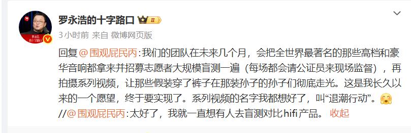 熟悉的那个罗永浩又回来了! 12月1日,罗永浩在回复网友留言时表示,在未来几个月,团队会把全世界最著名的那些高档音响都拿来并招募志愿者大规模盲测一遍(每场都会请公证员来现场监督),再拍摄系列视频,让那些假装穿了裤子在那装孙子的孙子们彻底走光。 一直以来,罗永浩在网友眼里就是一名斗士,一名为消费者争取合法权益的独行者,网友也乐见这样的罗永浩。 忆曾经,当年罗永浩怒砸西门子冰箱的时候还历历在目。