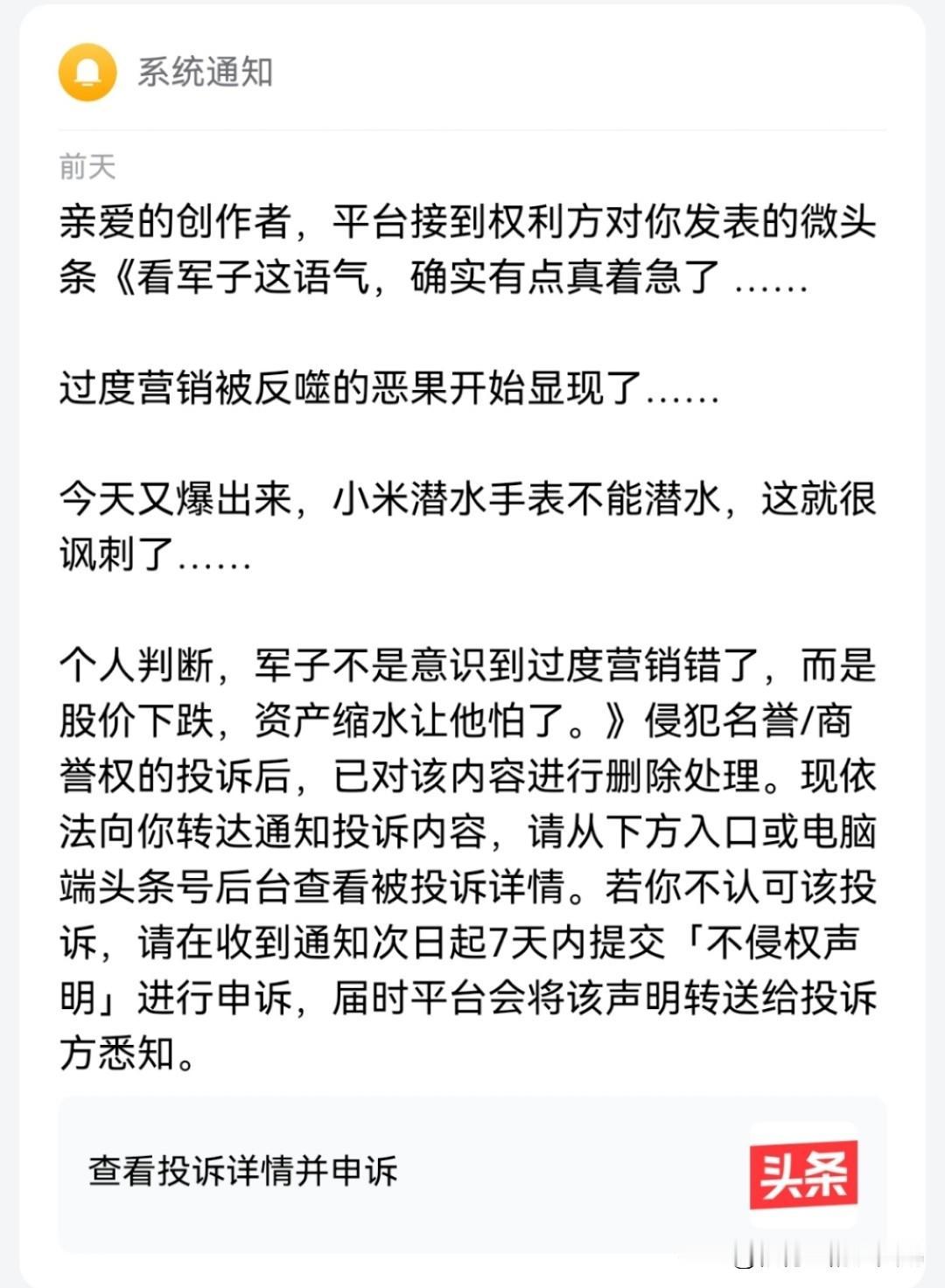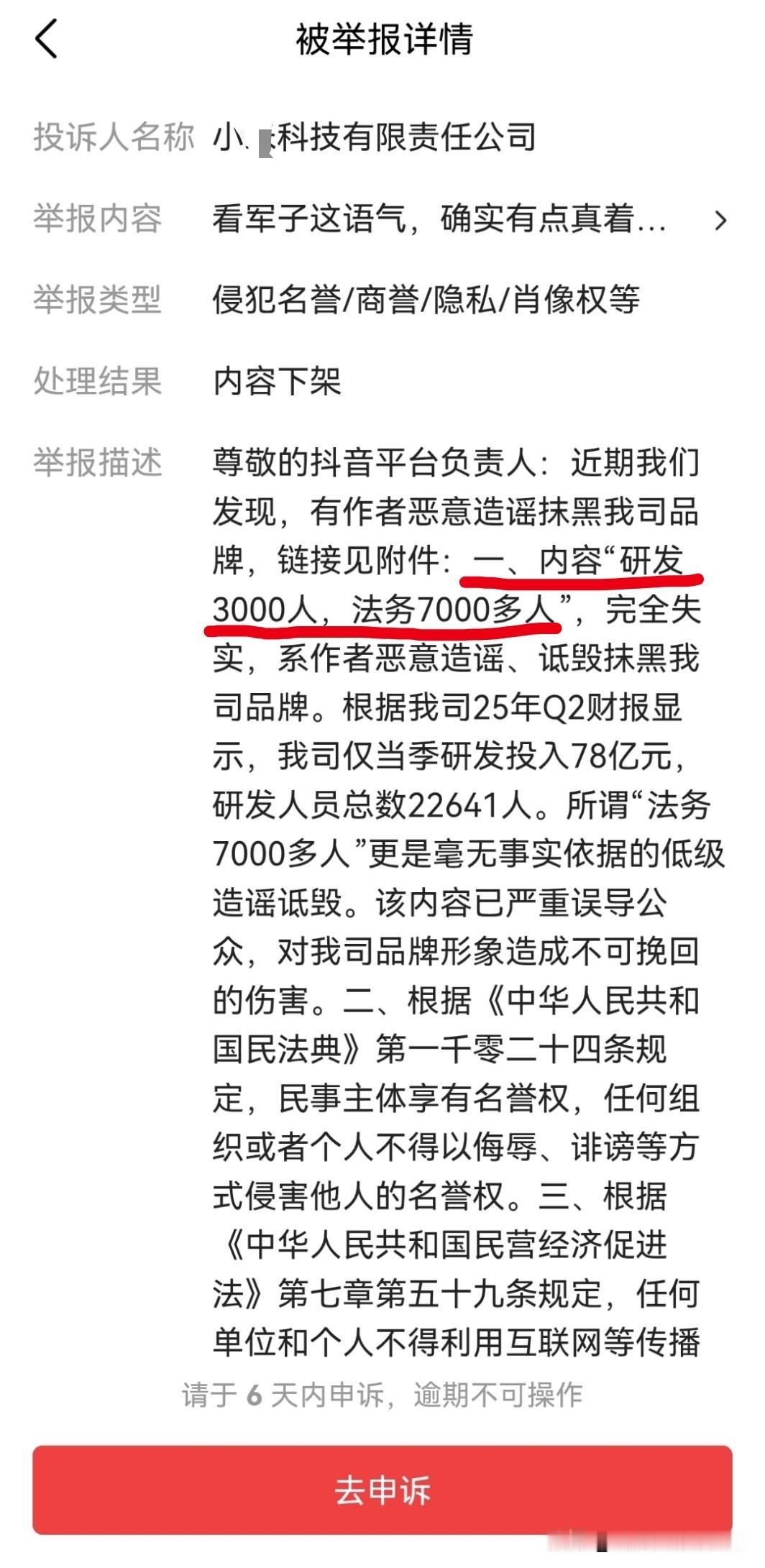 过度营销遭反噬又不是俺一个人持这样的观点, 这也算恶意造谣吗? 至于其举报描述里说的什么“研发3000,法务7000”,俺发的帖子里可一字未提,且从未说过这样的话, 更何况学过语文的都知道这只是个夸张手法,奈何粗粮反而破防了,以抠字眼的方式指责这句话是侵犯其名誉权,这不仅显得格局太小,而且属于无中生有的构陷本人。