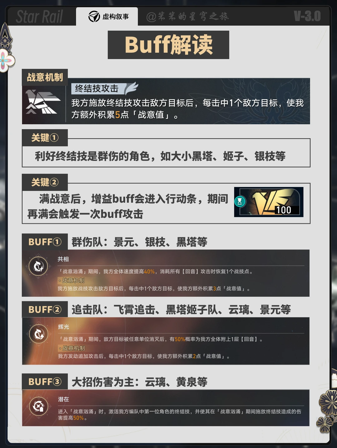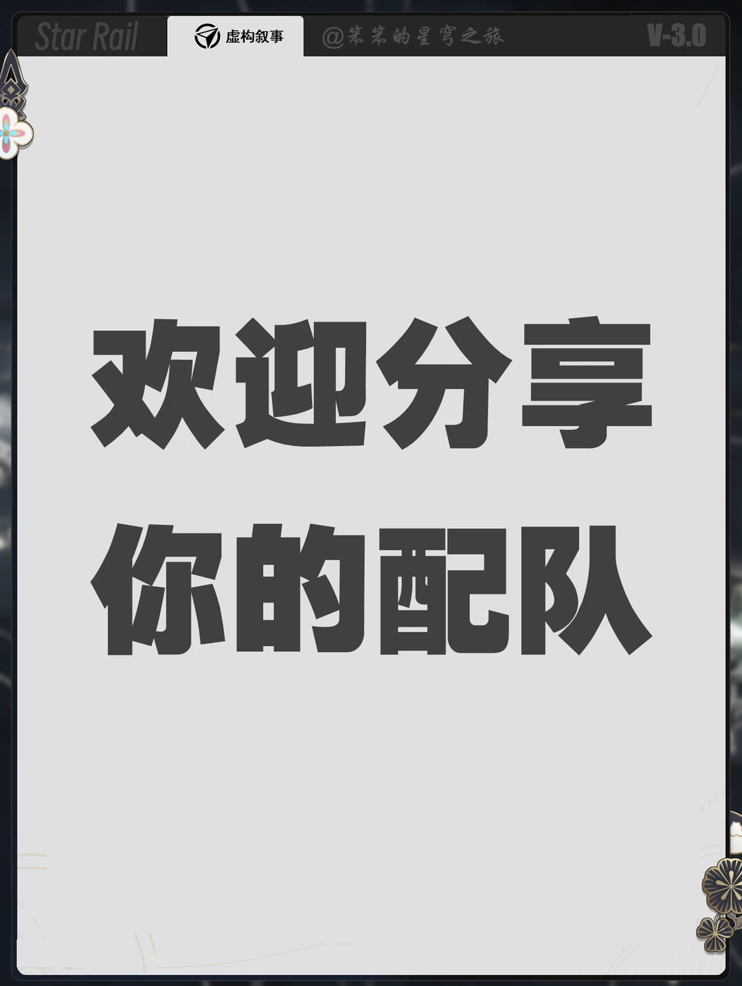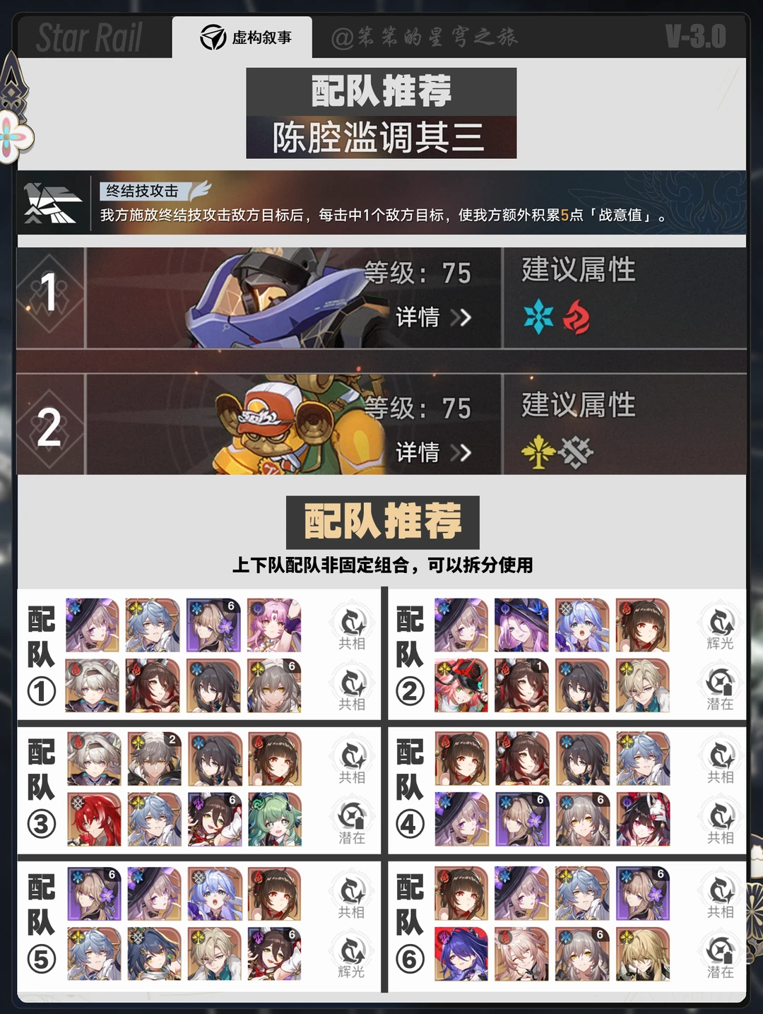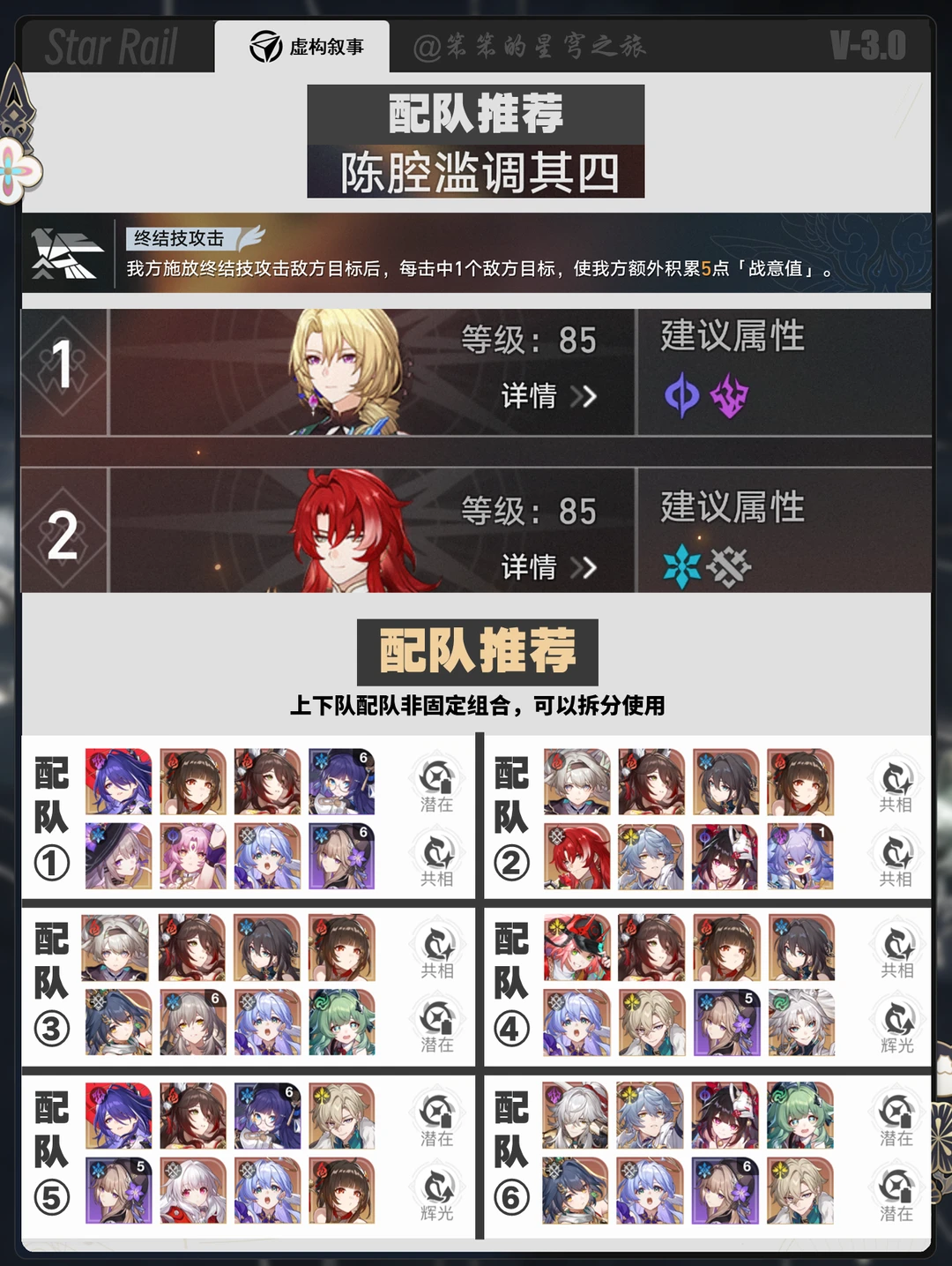 🐱大家好,我是笨笨的铲屎官 今天给大家带来都是3.0的虚构叙事 虚构这一期群伤队有优势 具体而言就是战技群伤的 如大黑塔、黑塔、景元等智识角色 大家可以分享一下你的配队哦