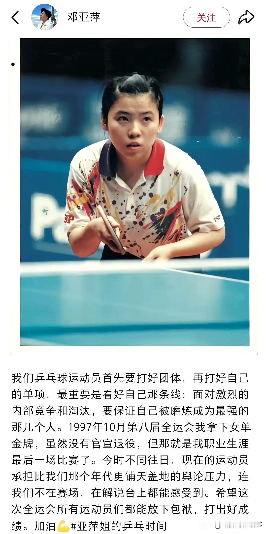 《邓亚萍的“大魔王胸怀”:退役都在等后辈接棒,这才是国乒魂》 邓亚萍的社交动态,把“国乒传承”写得戳心:她刻在骨里的“先团体后单项”,是拿满冠军都没说出口的信念。 1997全运夺冠后没官宣退役,是在等后辈接得住拍子——“他们能打,我就体面退;接不住,我再拿拍上”~如今解她说出的“舆论压力”,是过来人的疼:她早把自己活成了国乒的“护城河”,盼项目好,更盼后辈轻装赢。