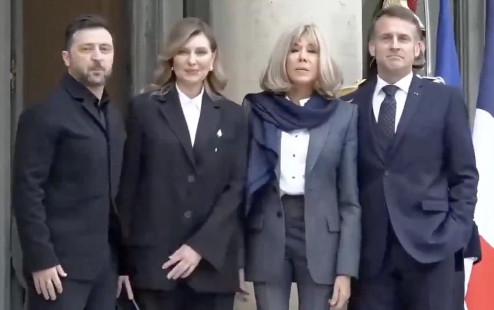【奥莱娜·泽连斯卡今天在爱丽舍宫受到了格外热烈的欢迎。 首先,布丽吉特·马克龙以亲吻的方式向她致意,随后法国总统本人也加入进来,热情地向她问好。】