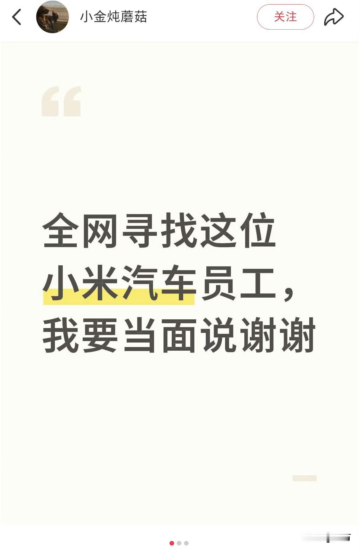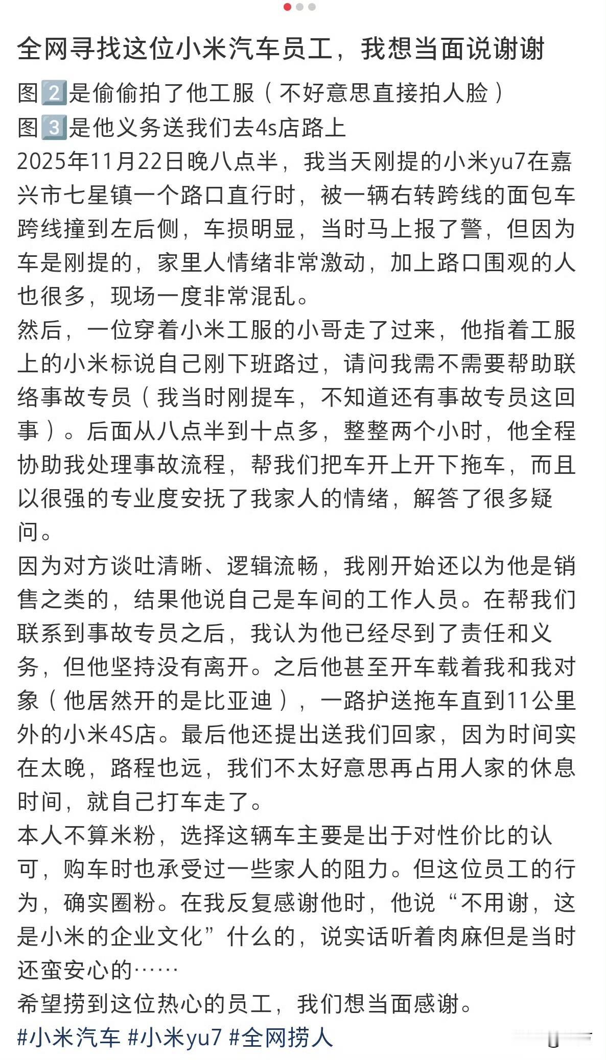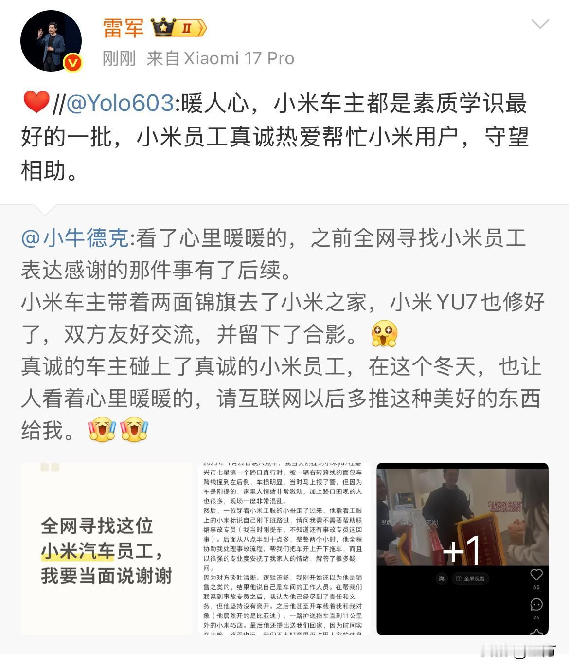 雷军:小米车主都是素质学识最好的一批,小米员工真诚热爱帮忙小米用户。 就在刚才,雷军专门转发了一个暖心的车主真实经历。 这个小米的汽车车主刚刚提了新车,结果在路上发生了交通事故,就在一筹莫展的时候,刚下班的小米某员工走在他面前,给他联系工作人员联系售后等等事情。 关键是这个小米员工做完之后不留姓名,就这样走了,所以他专门在网上发了帖子找这个人想表示感谢,后来他们也找到了这个人并且送去的感谢的锦旗。 当然,最关键的还得是他与这个员工之间的对话,以及这个员工反映出来的整体素质,这一点让雷军很感动,毕竟这个人乐于帮助或者互相帮助他们小米文化的一部分,可能就是这个点,让雷军觉得心里面都暖暖的。 所以专门把这个事情发到网上,让更多的人知道他们的员工在这方面的表现,以及小米的文化。 当然,雷军也表扬了这位车主,因为整个过程他描述的比较客观,而且也懂得爱心回馈这种车主与员工之间的好互动,让雷军认为小车主是素质和学士都比较好的一批。