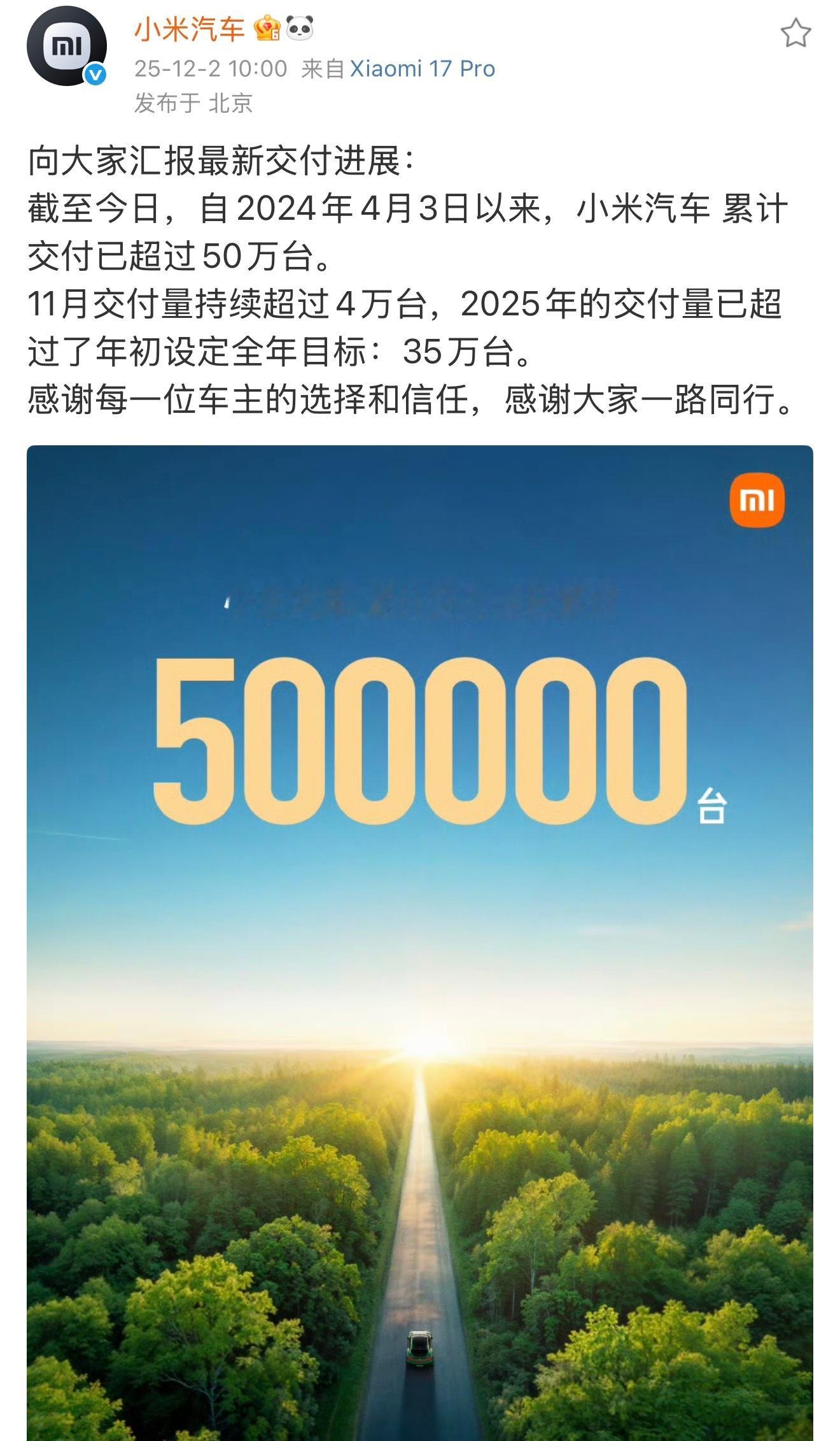 小米汽车交付量超过50万台,咱就说6座的小米汽车,什么时候上市,村长说村里的第1辆小米汽车交给我了
