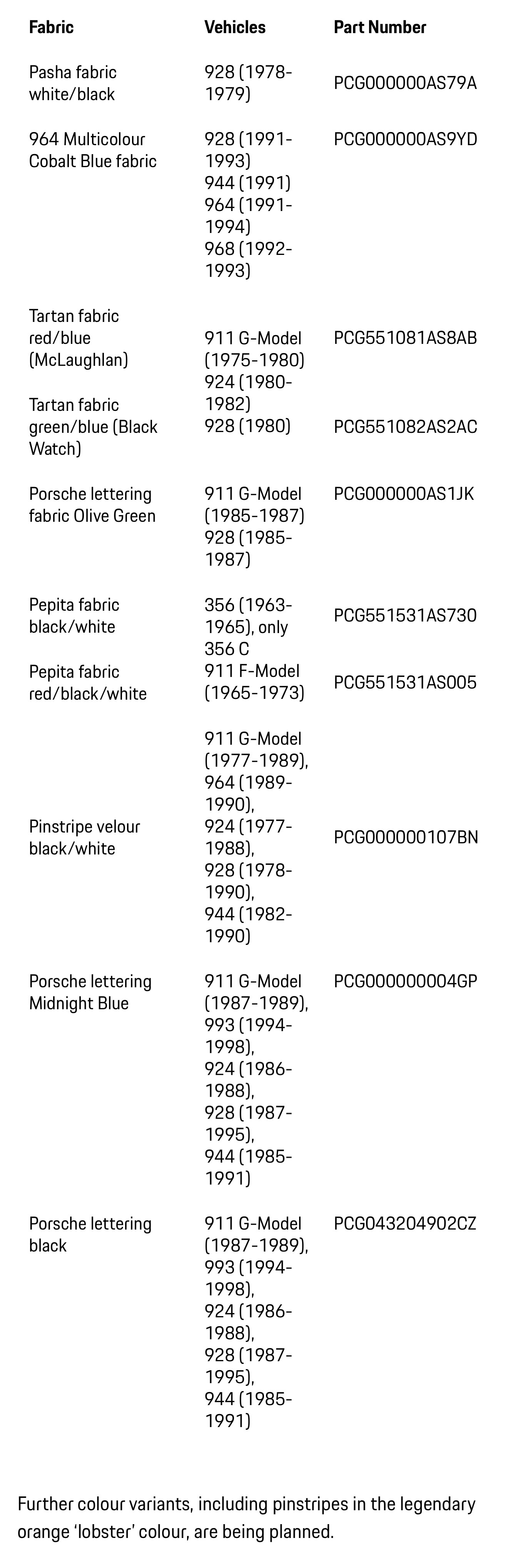 保时捷Classic宣布,他们将以原厂品质复活品牌历史上最具代表性的内饰织物:Pepita千鸟格、Tartan格纹以及充满视觉冲击的Pasha图案。这些织物将以1.5米× 2米裁片的形式,作为经典车型的官方修复用料重新开放订购,客户可以通过官方经销商和线上渠道购买;图4是保时捷网站上为客户准备的年款参考和零件号;保时捷Classic负责人Ulrike Lutz表示,此次复刻的出发点,是“填补一个长期存在的空白”:大量经典车的车主希望尽可能按照原厂规格修复内饰,但市面上充斥的仿制面料,要么材质不适合长期作为座椅面料使用,要么很快褪色、变形。 因此这批“新旧结合”的织物以保时捷原厂正品配件的标准进行生产和检测,在手感、耐磨性、耐光性以及复杂图案和配色的还原度上,都要通过一套完整测试流程,确保即便只包一张座椅,也能与保留原装面料的其他座椅融为一体。这就是保时捷最擅长的生意——帮有钱的客户挠心里最痒的那块“喜欢千鸟格是吧?我就知道你肯定有强迫症,我来帮亲解决……”大v聊车车评精选汽场全开保时捷