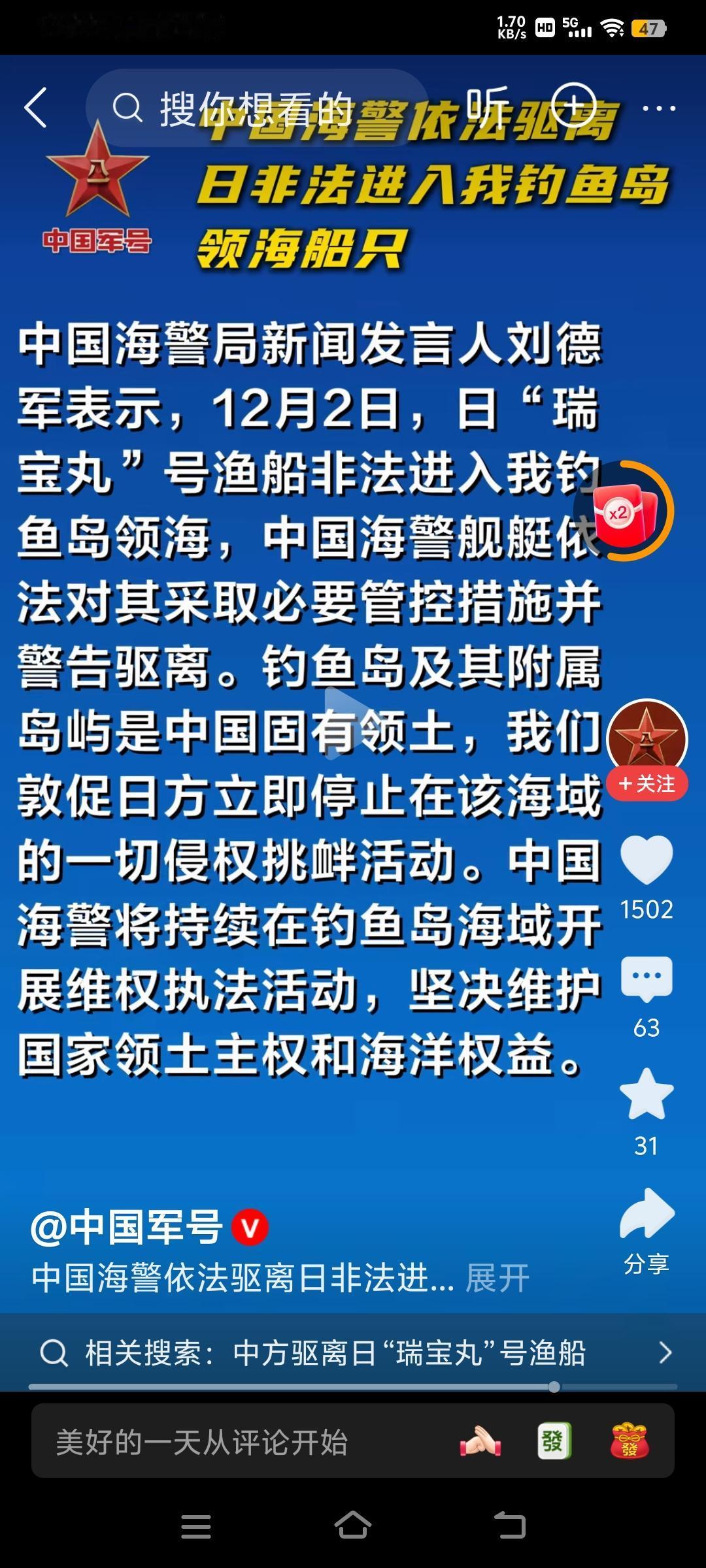 日本渔船到中国钓鱼岛海域捕鱼也不行了! 12月2日,日本渔船“瑞宝号”非法进入了我钓鱼岛海域,被我巡逻海警船依法采取必要管控措施并警告驱离。 钓鱼岛及其附属岛屿是中国固有领土,中国海警将持续在钓鱼岛海域开展维权执法活动,坚决维护国家领土主权和海洋权益。 以后日本的渔船是不能进入我钓鱼岛海域捕了,只有中国大陆和中国台湾的渔船才能去钓鱼岛海域捕鱼!