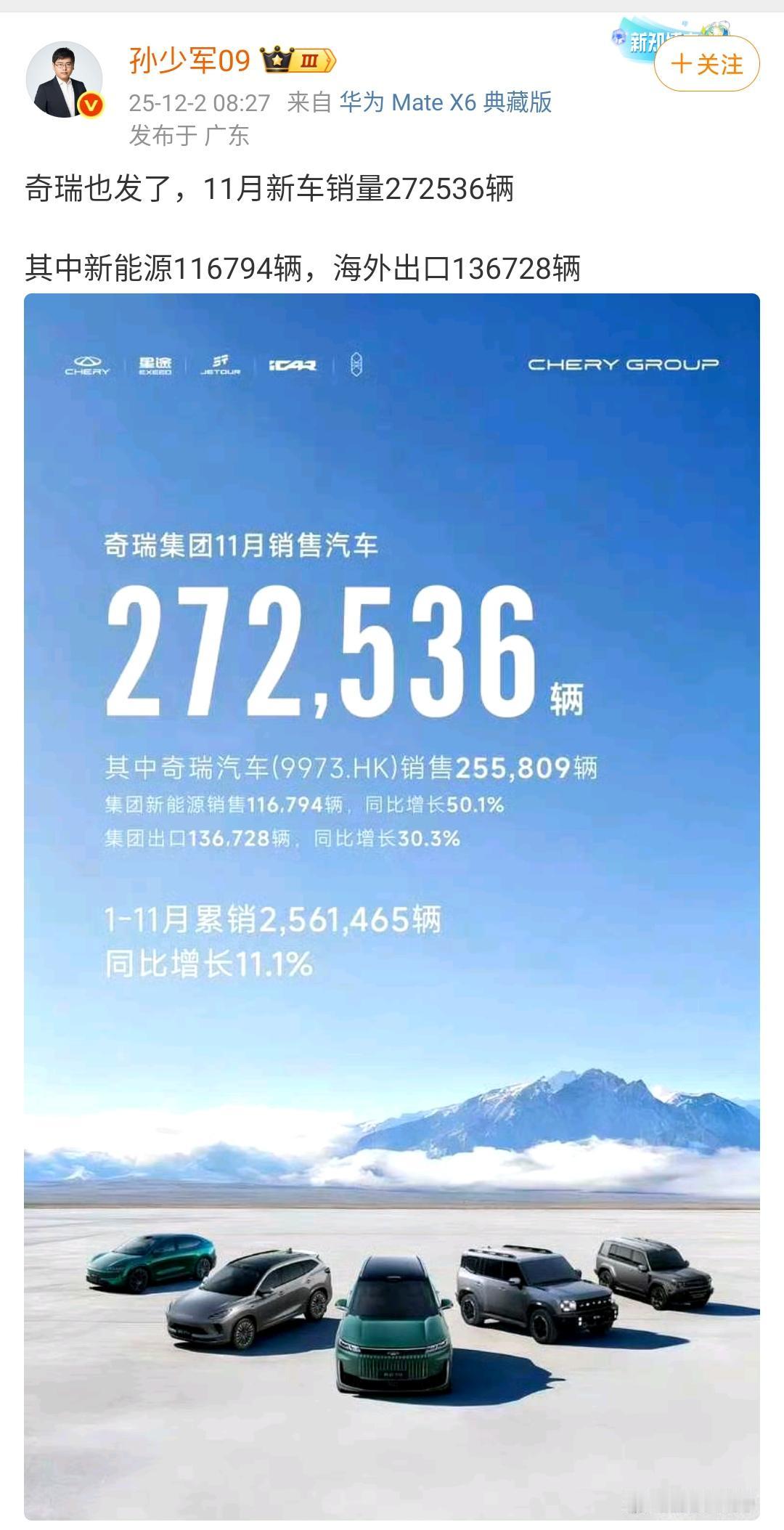 孙少军:奇瑞也发了,11月新车销量272536辆,其中新能源116794辆,海外出口136728辆! 奇瑞的销量非常的厉害,总销量中的很大占比,都是出口数据,不愧为连续21年的中国汽车出口销冠。 在新能源汽车业务方面,奇瑞终于跟上了步伐,其中有116,000多辆都是新能源汽车的销量。 奇瑞新推出来的智界和icar汽车,都是针对不同方向的尝试,做的效果还是非常不错的,各位是怎么看的?欢迎评论区留言。