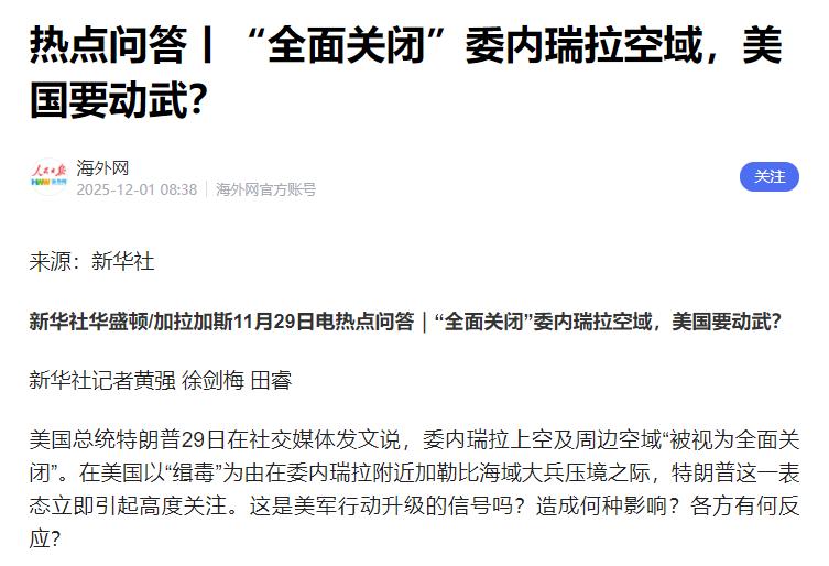 特朗普终于不装了!关闭领空,轰炸机出动! 最近不少人都在问,美国在加勒比海摆了那么多军舰和士兵,轰炸机也飞了好几次,真要对委内瑞拉动手了? 其实这事不能只看表面的军事部署,得从里到外扒清楚美国的真实算盘,还有各方的牵制力量,才能判断冲突到底会不会打起来。 先说说美国为啥把架势摆得这么足。最核心的还是能源,委内瑞拉的石油储量占了全球五分之一,这可是块肥肉。现在美国自己的能源自给率在降,国内物价又不稳定,要是能把委内瑞拉的资源攥在手里,相当于给经济上了道保险。 而且在拉美搞点动作,也能显出美国的影响力还在,这对想展现强硬姿态的特朗普来说很重要。但摆架势不代表真要打,毕竟打仗的代价谁都扛不住。 俄乌战争打了这么久,烧的钱不计其数,美国要是再开一个战场,国内的反对声肯定小不了,尤其是现在失业率还不低,老百姓更关心自己的日子能不能过好,没人愿意为遥远的战争买单。 再看美国的盟友们,这回明显不给力。英国和法国直接就说了不掺和,连情报合作都暂停了。不是他们跟美国闹掰了,实在是没力气再折腾。 乌克兰那边已经耗了太多资源,国内通胀高得厉害,老百姓更在乎暖气费够不够,哪有心思管拉美的事。 以前美国一招呼,盟友们都跟着上,现在连最亲近的英法都打退堂鼓,美国要是真要开战,就得自己扛下所有,这种孤立无援的仗,美国可没那么愿意打。 还有俄罗斯这个牵制因素。俄罗斯明着表态支持委内瑞拉,反对美国干涉。当然俄罗斯也有自己的小算盘,乌克兰战场陷进去了,要是能在拉美给美国找点麻烦,就能分散美国的注意力。 但俄罗斯自己的情况也不轻松,国内有不少问题要处理,能不能长期给委内瑞拉撑腰还不好说。不过就算是这样,美国也得掂量掂量,真打起来会不会把俄罗斯彻底卷进来,变成更大的冲突,这可不是美国想看到的。 最关键的一点是,表面上剑拔弩张,暗地里双方早就坐下来谈过了。有消息说特朗普和马杜罗在月底秘密见了面,聊的就是石油和制裁的事。这就很能说明问题了,要是真打算开战,何必偷偷谈判? 特朗普的套路其实很明显,先把军事压力拉满,让对方感觉到疼,然后再坐下来谈条件,这样就能用最低的成本拿到自己想要的东西。这种软硬兼施的办法,比真刀真枪打仗划算多了。 说到底,美国真要对委内瑞拉动手的可能性不大。军事部署更多是种谈判筹码,目的是逼委内瑞拉在石油利益上让步。 毕竟打仗对谁都没好处,委内瑞拉的经济会垮掉,全球油价会暴涨,美国自己的经济也会受影响。现在各方都在试探和博弈,虽然局势紧张,但真要擦枪走火引发战争,可能性其实很低。 毕竟理智最终会战胜冲动,没人愿意承担战争的沉重代价。
