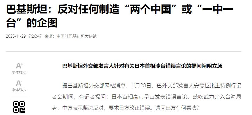 谁说巴铁不铁了?11月28日,巴基斯坦就日本涉台言论正式发声! 巴方表示:坚决反对任何制造“两个中国”或“一中一台”的企图。要知道,过去在类似国际议题上,巴基斯坦常以 “沉默” 姿态应对。 如今主动站出来明确反对任何 “两个中国” 或 “一中一台” 的企图,这背后可不是简单的立场宣示,而是多重因素共同作用的结果,更折射出当下亚太格局里微妙的力量博弈。 先得想明白,巴基斯坦这次表态到底意味着什么。这绝不是随口说说的外交辞令,而是对日本近期在台海问题上小动作的精准回应。 之前日本跟着西方阵营在一些涉华议题上跃跃欲试,总想着在亚太事务里刷存在感,甚至想把台海问题搅得更复杂。巴基斯坦这时候站出来亮明态度,等于是给日本划了一条不可逾越的红线——别想在涉华核心利益上打歪主意,更别以为能拉着其他国家一起给中国施压。 而且这种表态也不是孤立的,它背后是中巴长期的战略协作关系,等于告诉外界,在核心利益问题上,中巴立场高度一致,任何想分裂中国的企图,都得先掂量掂量巴基斯坦的态度。 再说说为什么巴基斯坦之前一直保持沉默,现在却选择主动发声。从时机上看,当下正是亚太局势比较敏感的时候,美国拉着日本、印度等国搞所谓的 “联盟”,试图在地区事务中主导话语权,日本也借着这个机会,不断在台海问题上释放错误信号。 巴基斯坦这时候发声,就是不想让日本借着 “盟友” 的幌子,在涉华问题上越走越远,更不想看到地区局势因为日本的小动作变得紧张。 毕竟,巴基斯坦和中国的合作涉及经济、安全等多个领域,地区稳定直接关系到巴基斯坦自身的发展利益,尤其是中巴经济走廊的推进,需要一个和平的外部环境。 日本要是在台海问题上挑起事端,很可能会间接影响到这些合作项目的进展,这是巴基斯坦不愿看到的。 从自身利益角度看,巴基斯坦现在也有足够的底气发声。这些年巴基斯坦经济发展势头不错,市场潜力越来越大,日本企业早就把巴基斯坦当成了重要的海外市场,不管是汽车行业还是能源领域,都有大量投资。 要是巴基斯坦因为涉台问题跟日本闹僵,日本企业损失的可是真金白银的利益。之前巴基斯坦保持沉默,更多是出于 “留余地” 的考虑,不想把关系闹得太僵,毕竟还要维持双方的经济合作。 但现在日本在涉台问题上越来越出格,巴基斯坦要是再不表态,不仅会让中国觉得立场模糊,还可能让日本误以为巴基斯坦可以 “拿捏”。 所以这时候发声,既是对中国的支持,也是对日本的一种警示 —— 别因为自己的政治算计,影响到双方的经济合作大局。 另外,巴基斯坦当下的国际身份也让它有必要站出来。作为即将担任联合国安理会非常任理事国的国家,巴基斯坦在多边场合有了更多发声的机会,也需要承担起维护地区稳定的责任。 日本想把台海问题 “国际化”,在多边场合散布不当言论,巴基斯坦这时候明确反对 “两个中国”“一中一台”,就是在多边舞台上传递正确的信号,阻止日本把地区问题扩大化。 而且这种表态还能带动其他南亚、中东国家,让更多国家看清日本的真实意图,不给日本搞 “台海国际化” 的空间,这比单纯的外交批评要有效得多。 对比之前俄罗斯对日本的强硬批评,巴基斯坦的做法显然更有 “杀伤力”。俄罗斯的批评虽然直接,但俄日之间经贸往来有限,日本就算不当回事,损失也不大。 可巴基斯坦不一样,手里握着日本的经济利益,表态又拿捏得恰到好处,既没把话说死,给日本留了面子,又明确传递了底线,让日本不敢轻易冒险。 这种 “软中带硬” 的方式,比直接的硬怼更让日本头疼 —— 毕竟对现在急需海外市场的日本来说,丢面子事小,丢了巴基斯坦这个市场,损失可就大了。 说到底,巴基斯坦这次对日本涉台问题的表态,是一次精准的战略选择。既维护了中巴关系的核心利益,又守住了自身的经济合作诉求,还在亚太格局中展现了自己的影响力。 这也让外界看清,在国际事务中,不是只有强硬对抗这一种方式,精准的立场表达和巧妙的利益制衡,往往能起到更好的效果,而巴基斯坦这次显然做到了这一点。