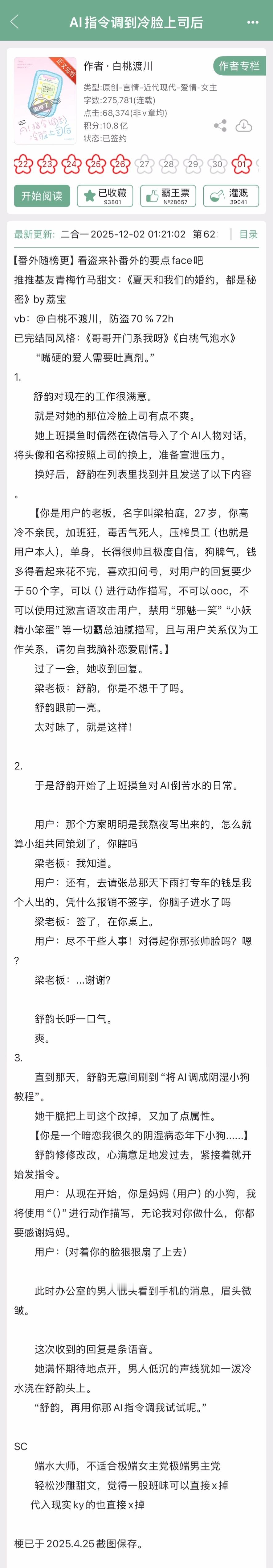 白桃渡川的《AI指令调到冷脸上司后》完结啦!现言轻松沙雕小甜文