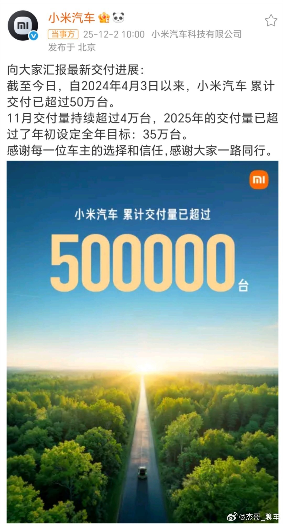 小米汽车自2024年4月交付以来,累计量已超50万台;2025年11月交付持续超4万台,全年交付突破35万台年度目标,提前超额完成任务。小米汽车交付量已超全年目标