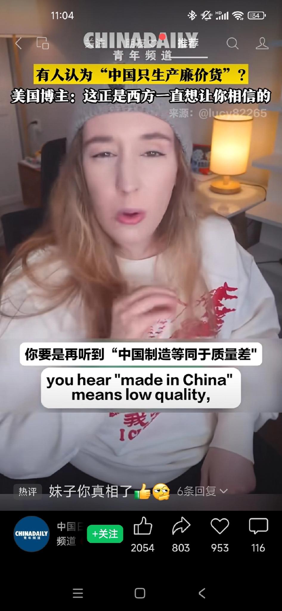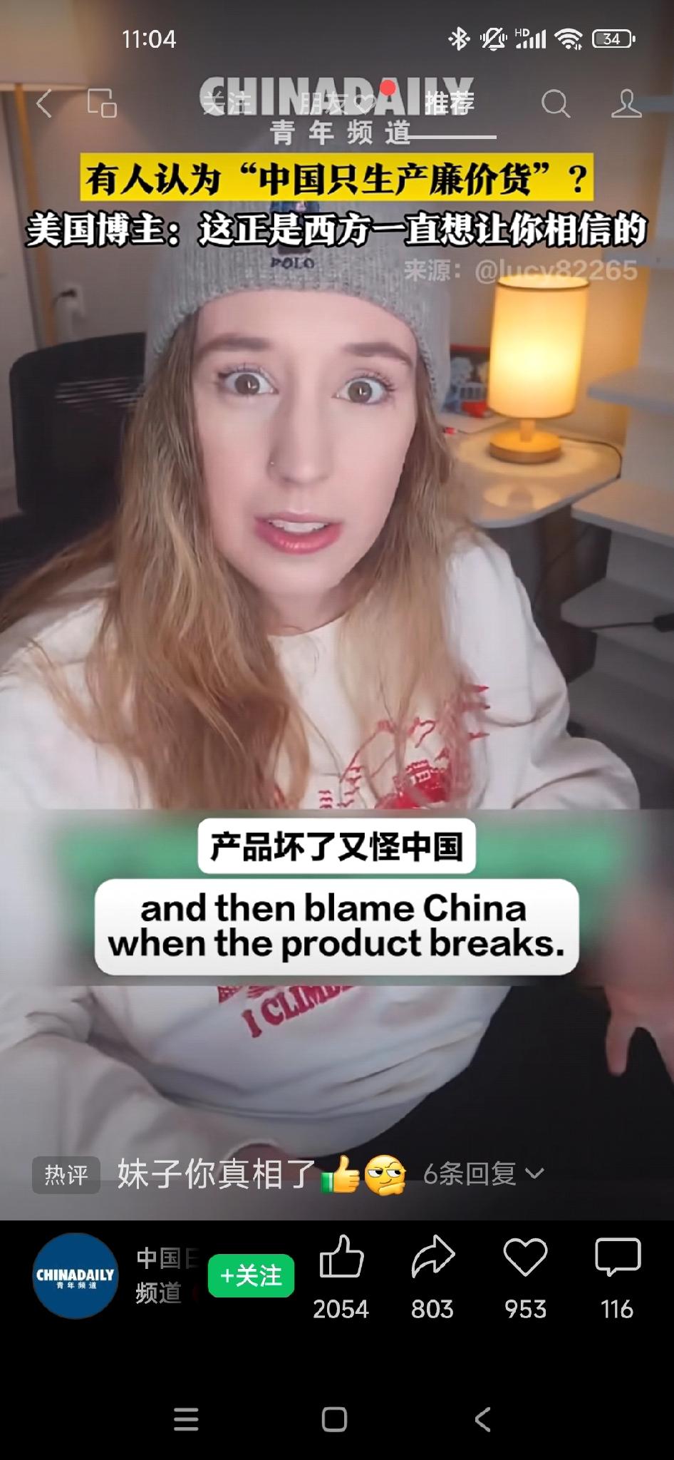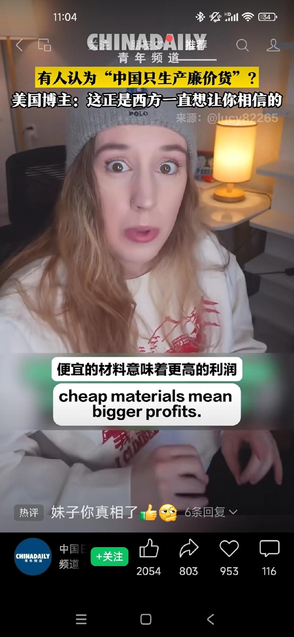 美国博主:这正是西方一直想让你相信的!妹子,你真相了! “中国只生产廉价货“,这一直是西方想让你相信的。 今天我来告诉一个小秘密。 其实是你买东西的那些公司,在采购廉价货。 他们设计产品时,可以选择用什么材料,可以选择最好的,也可以选择最差的。 你猜怎么着?他们会选择最差的材料。 原因是便宜的材料意味着更高的利润。 他们把生产外包给中国,加价500%,产品坏了又怪中国。 这时候他们会说,一分价钱一分货,但真正定价的人是他们,偷工减料的决定也是他们做的。 我尝试过很多中国制造的产品,他们质量很好。 我也用过中国各种科技应用。 他们真的很创新,非常好用。 中国的应用软件也在持续更新迭代。 以后如果你再听到“中国制造就等于质量差”这样的话,问问自己,到底是谁在偷工减料?到底是谁在从中谋利? 决定你购买产品质量的不是中国,而是资本主义! 编者:这位美国朋友,她脑子太清晰了,她太懂了,她把谎言真相了!大家怎么看呢?