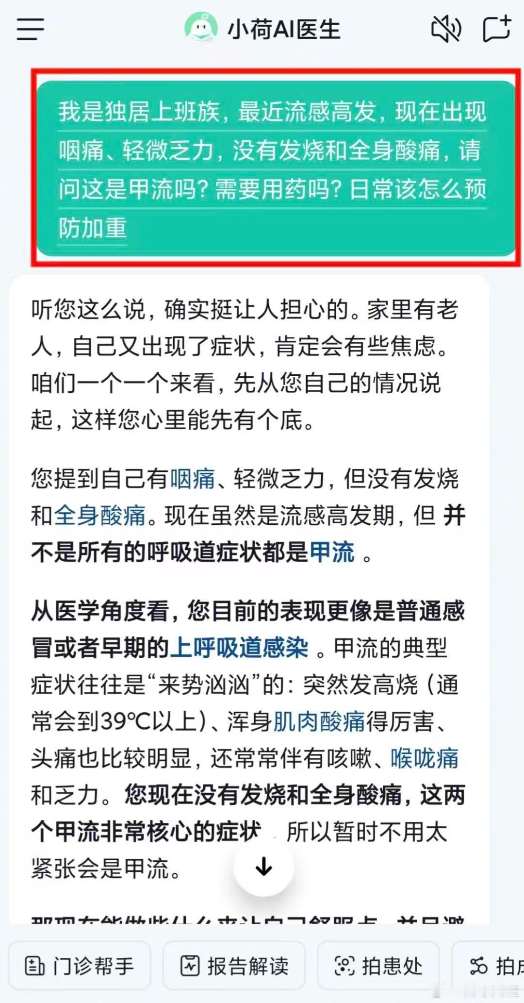 AI医生总结甲型流感症状特点 本打工人 + 女生真的经不起甲流折腾!H3N2 毒株肆虐,高烧反复 + 肌肉酸痛,连通勤都没力气 实测小荷AI医生 太懂我的需求了!极简操作 3 步搞定患处解读,对话式问诊精准识别甲流症状,护理建议讲得明明白白~ 7x24 小时免费咨询,数据加密不泄露隐私,熬夜加班、生理期不适都能自查!搭配疫苗接种 + 少聚集,流感季也要好好爱自己~