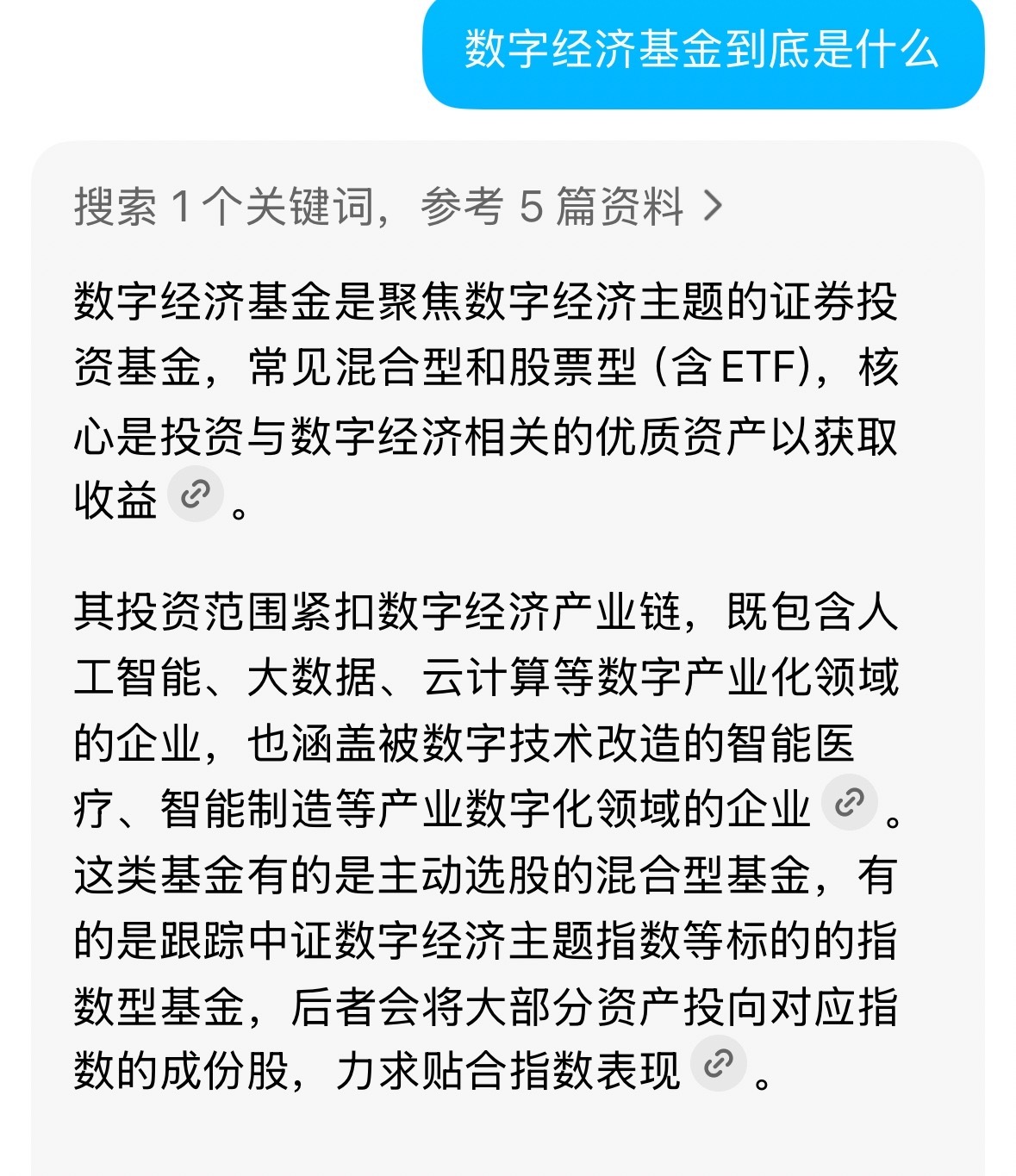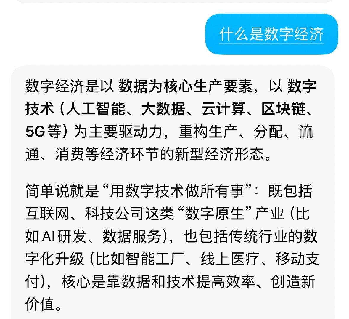 今天试水一万中银数字经济019427,好多人都不知道数字经济是什么,其实只不过是他们起了个高大上的名字,其实就是AI科技,我用AI搜了下它的回答,具体你们也可以搜搜