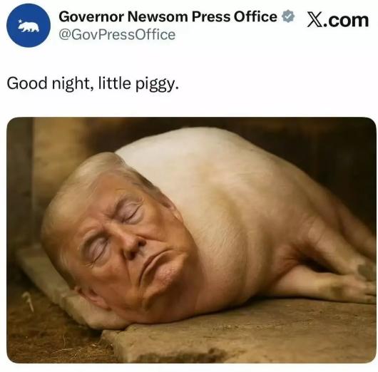 加州州长纽森在社交平台X上发了张图,把特朗普的照片P成了一头猪。这种赤裸裸的人身攻击,放在咱们普通人身上肯定要闹上法庭,但在美国政坛却成了家常便饭。 加州州长纽森把特朗普P成猪的举动,本质上是美式政治生态中"符号战争"的极端化呈现。这种看似荒诞的行为,实则嵌套着美国两党博弈的深层逻辑。 当政策分歧陷入僵局,当治理能力遭遇质疑,政治人物往往选择将对手"去人格化",通过消解对手的公共形象来争夺叙事主导权。 这不是纽森的独创,而是特朗普时代以来形成的政治生存法则:用娱乐化的攻击替代政策辩论,用情绪动员取代理性对话。 从2025年的时间线回溯,两人的恩怨始于洛杉矶移民冲突。特朗普声称与纽森通话协调国民警卫队部署,却被曝出通话记录早于政策宣布时间,纽森当即在社交媒体上晒出证据,嘲讽总统"连通话对象都搞不清"。 这场"电话门"撕开了两党在移民政策上的对立,更暴露了特朗普式政治的核心缺陷——当谎言被数据揭穿,人格信誉的崩塌必然引发对手的加倍反噬。纽森团队显然深谙此道,他们捕捉到特朗普最脆弱的命门:这个靠真人秀起家的政治人物,最害怕的不是政策批评,而是被解构为"滑稽的小丑"。 于是我们看到,从模仿MAGA风格推出"纽森永远正确"的周边商品,到在X平台用全大写字母模仿特朗普的咆哮体,再到这次P图事件,纽森的每一步都在复制特朗普的传播逻辑。 这种镜像对抗的本质,是民主党新生代意识到:在注意力经济时代,传统的精英式批评无法穿透特朗普构建的"受害者叙事",必须用其人之道还治其人之身。 当特朗普将政治对手污名化为"社会主义者""叛国者"时,纽森选择更直观的视觉符号——猪,这个在美国文化中象征贪婪与愚蠢的动物,精准击中特朗普最被诟病的"商人政客"标签。 更深层的动力来自2028大选的布局,纽森作为民主党冉冉升起的新星,需要在党内初选前完成两件事:一是巩固进步派基本盘,二是争取中间选民对"反特朗普"叙事的认同。攻击特朗普的人格缺陷,既能迎合民主党基层对特朗普的厌恶,又能避免陷入具体政策的争议泥潭。 毕竟,当78%的加州选民认为特朗普"缺乏总统应有的尊严",将其丑化为猪的形象,实质是将个人攻击转化为"捍卫政治文明"的集体行动。 这种现象的背后是美国政治娱乐化的二十年演变,从克林顿的"拉链门"到奥巴马的"出生门",人身攻击始终是两党斗争的暗器,但特朗普将其升级为明枪。他用"骗子希拉里""瞌睡乔"等绰号重构对手形象,用推特风暴制造信息洪流,迫使对手陷入"回应则失格,不回应则失声"的困境。 纽森的P图,本质上是对这种传播模式的降维打击——既然特朗普擅长将政治人物符号化,那就用更夸张的符号彻底消解其严肃性。当特朗普在集会上嘶吼"纽森是加州的灾难"时,纽森团队用一张P图完成了舆论反杀:你连被严肃对待的资格都没有。 值得注意的是这种攻击模式正在重塑美国政治的话语规则,2025年的数据显示,纽森X账号的互动量中,62%来自对特朗普的讽刺内容,而政策讨论仅占18%。这不是个例,众议院议长麦卡锡的"小丑佩洛西"表情包、德桑蒂斯的"迪士尼觉醒暴政"叙事,都在证明:当政治辩论沦为符号战争,选民的注意力就成了最稀缺的资源。纽森团队显然算过账:一张P图带来的流量,相当于三场政策演讲的传播效果。 但这种玩法的代价正在显现,当政治人物的公共形象被简化为表情包,选民对治理能力的期待也在降低。2025年洛杉矶时报调查显示,45%的受访者认为"纽森比特朗普幽默",但仅有28%相信他能解决住房危机。 这种认知错位,恰恰暴露了美式政治的深层危机——当攻击对手成为主要执政手段,政策创新就必然让位于舆论攻防。纽森或许赢得了单次战役的胜利,但输掉的可能是公众对政治的最后一丝信任。 在这场没有硝烟的战争中,P图事件不过是最新的战术动作。它揭示的真相是:美国两党已经陷入"互害式竞争"的怪圈——共和党需要特朗普的争议维持基本盘,民主党需要特朗普的存在凝聚反对力量。当纽森把特朗普P成猪时,他不是在批判某个政治人物,而是在参与一场精心设计的政治戏剧:观众需要反派,而他负责提供更夸张的反派形象。这种循环一旦形成,任何试图回归理性的声音都会被淹没在表情包的狂欢中,这或许才是美式民主最危险的时刻。